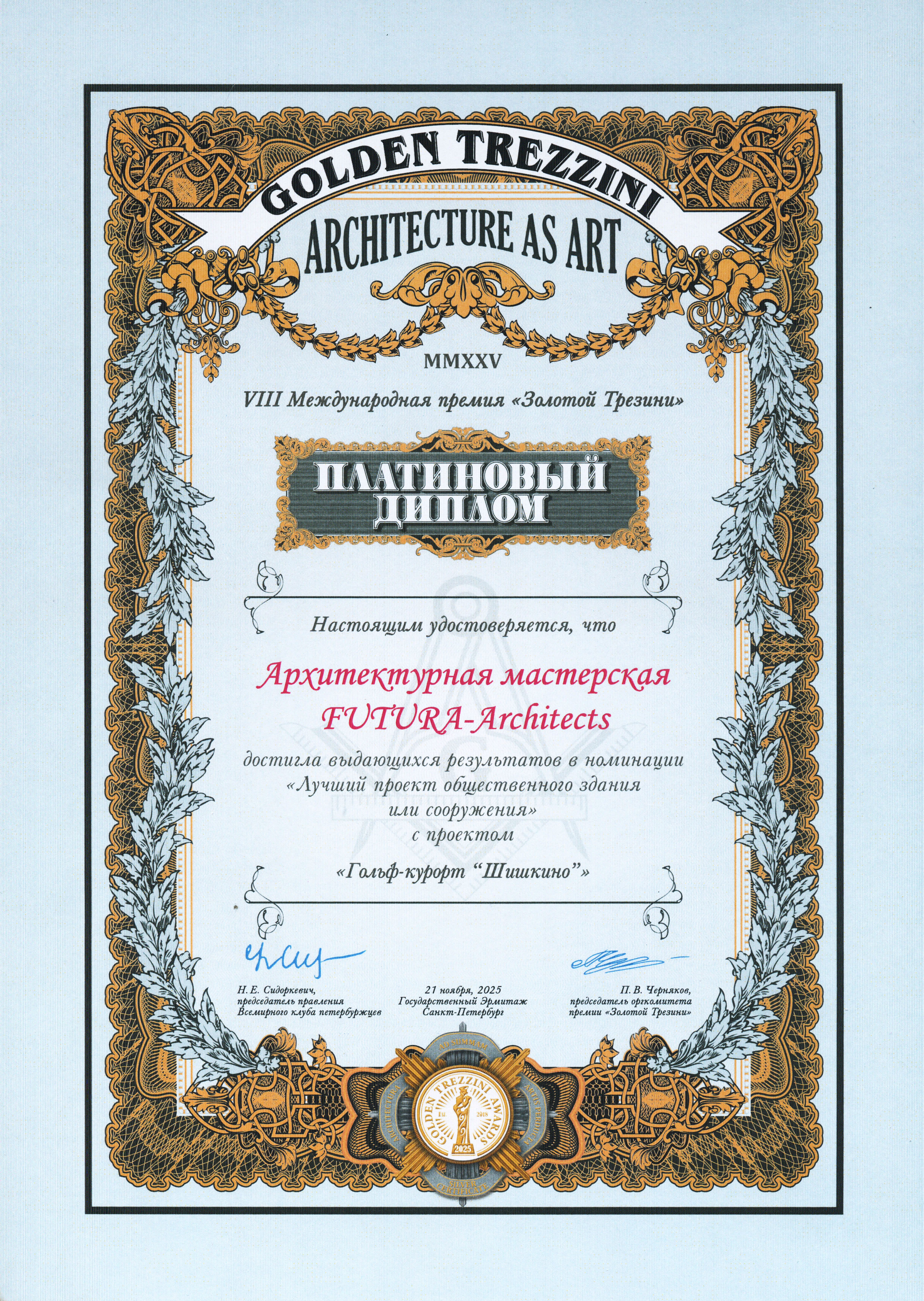 В основе архитектурной композиции комплекса лежит идея единения с природой. Одной из доминант территории гольф-курорта является протяженный белоснежный объем гостиничного-оздоровительного комплекса с выразительным силуэтом. Бионическая форма здания повторяет сложный рельеф гольф-полей. Объекты спортивной и развлекательной инфраструктуры решены в стиле современных шале, выполненных из природных материалов – дерева и натурального камня.