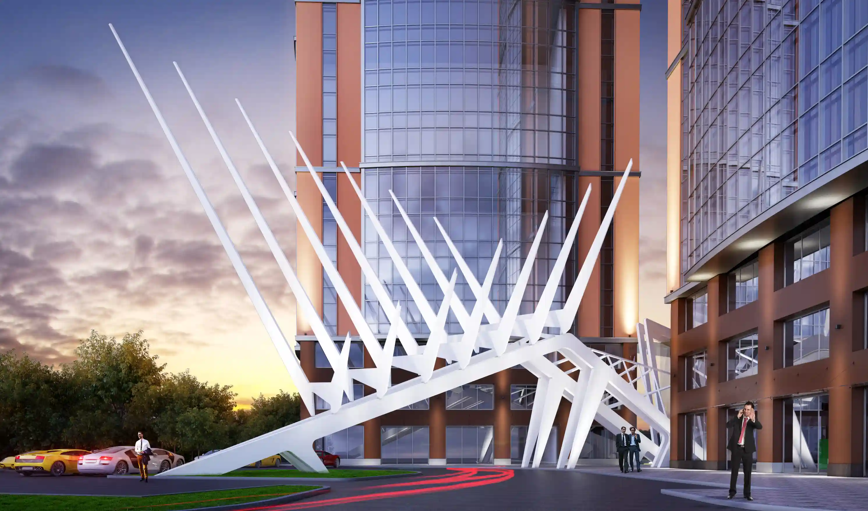 С другой стороны, форма здания местами больше имеет некоторые особенности транспортного дизайна, чем отсылает нас к стилю Streamline середины прошлого века. Это связано больше не с местом, а с желанием клиента подчеркнуть его амбициозность и динамизм. Здание в основном будет восприниматься на расстоянии 100-200 метров со стороны развязки, и в этом случае форма здания становится важнее, чем его детали и текстура. С более близкого расстояния его мало кто будет воспринимать, так как все пешеходные маршруты проходят далеко за ним. Но, тем не менее, даже с более близкого расстояния есть большое отличие от типовой застройки – облицовка под кирпич, угловые элементы, верхнеподвесные окна с зауженным профилем, мелкая расстекловка.