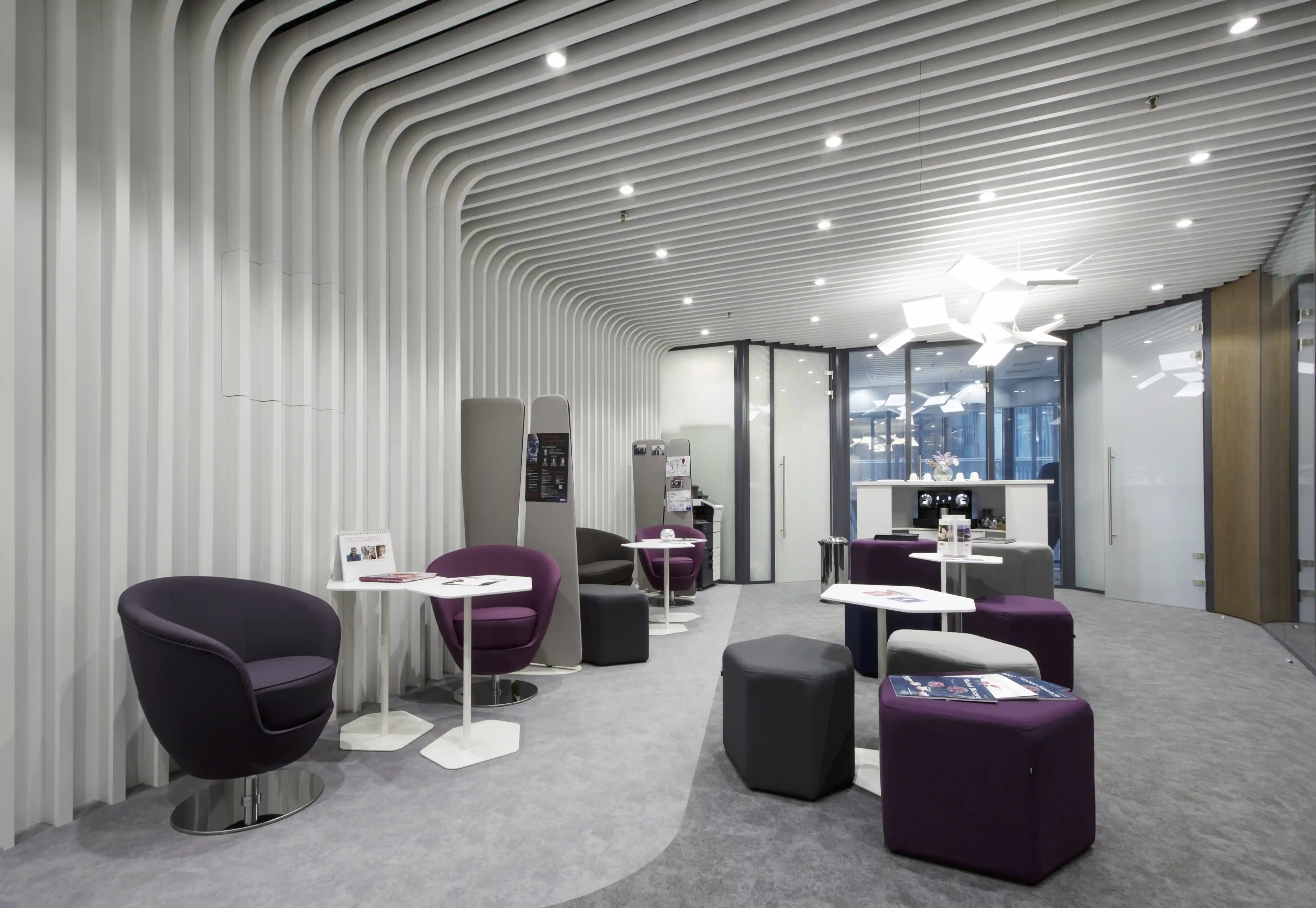 В редкие солнечные дни между ламелями проникают тонкие лучи света, создавая сложную и неповторимую световую инсталляцию, проникающую внутрь здания.