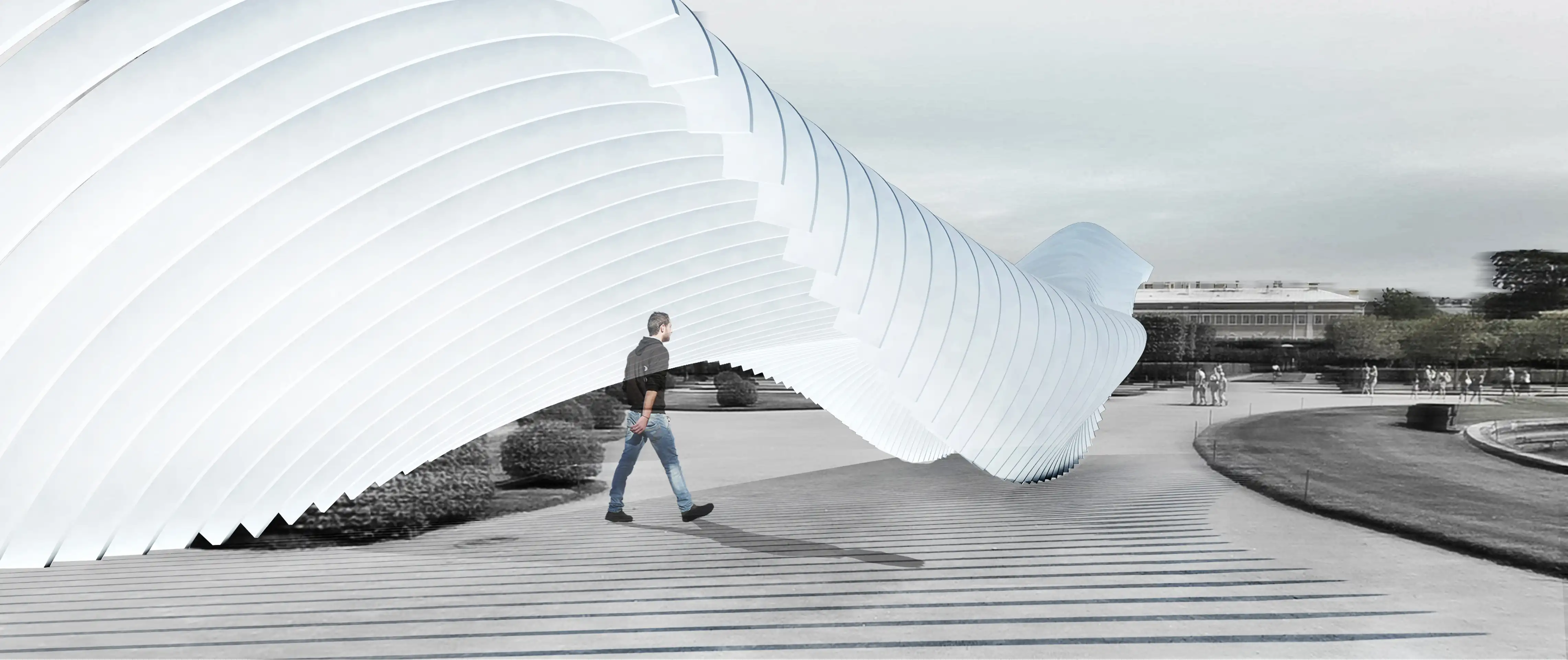 Инсталляция «Волна» играет роль встречающей композиции, разорванной в центре таким образом, чтобы сквозь решетчатую современную форму проступал Большой Петергофский дворец. Линейная структура имеет сложную конфигурацию, за счет этого объект не смотрится статичным, а раскрывается с разных ракурсов. Элементы предлагается выполнить из фанеры, общая длина двух структур – 100м. Тема фонтанов в инсталляции получает новое звучание.