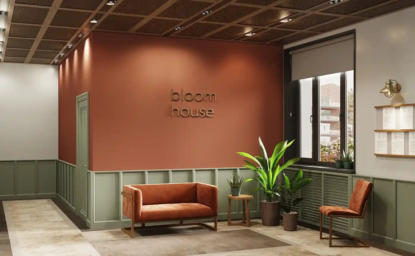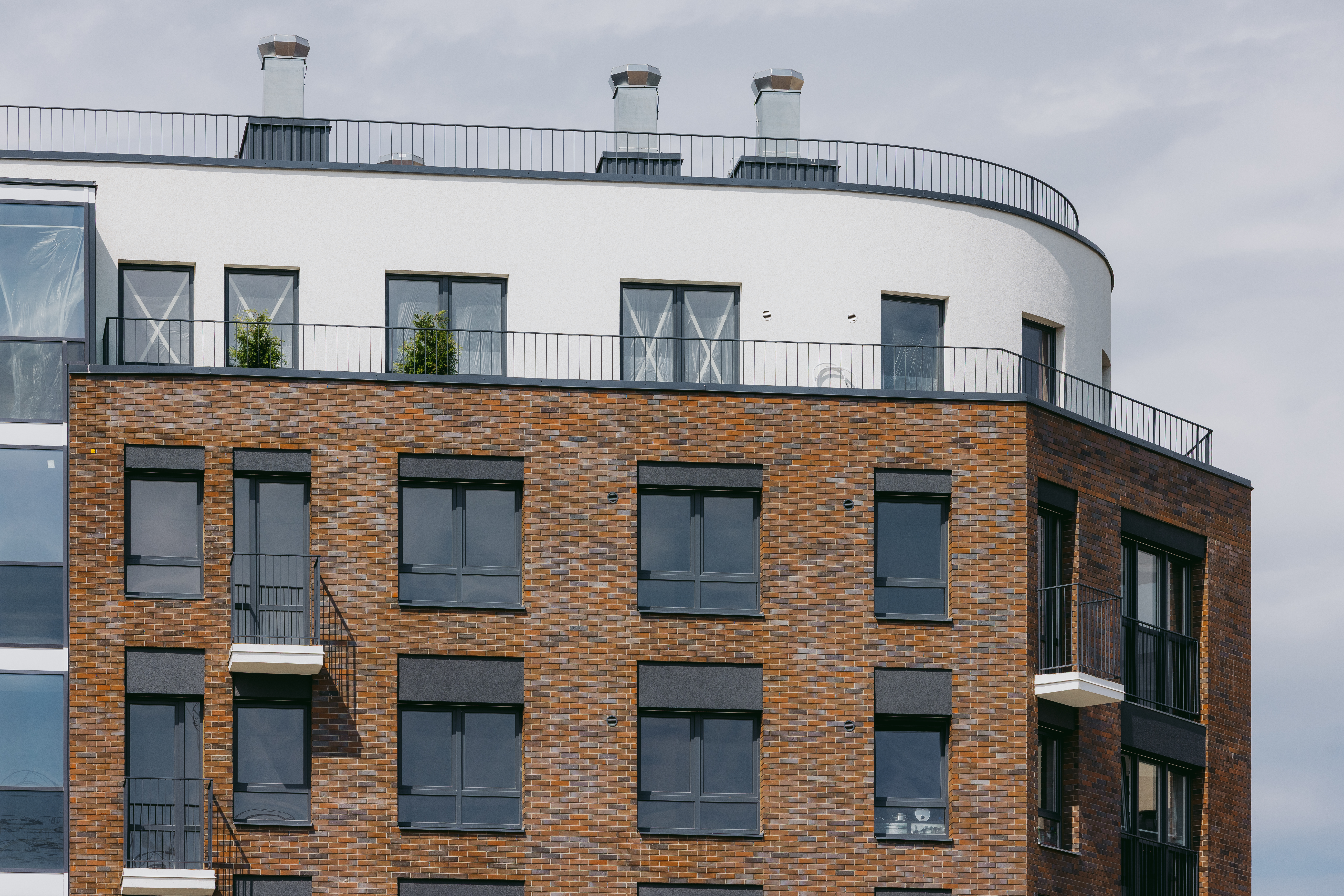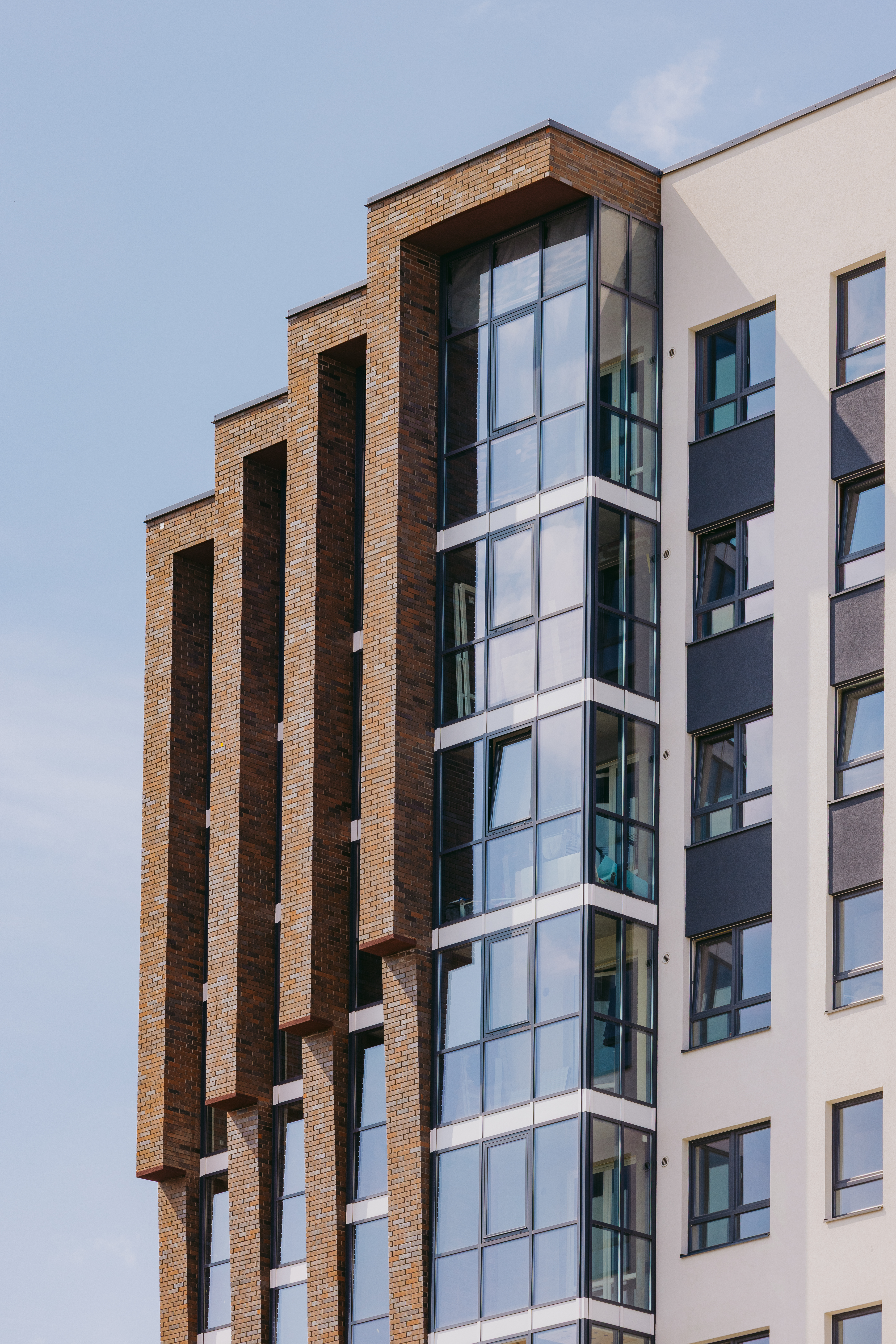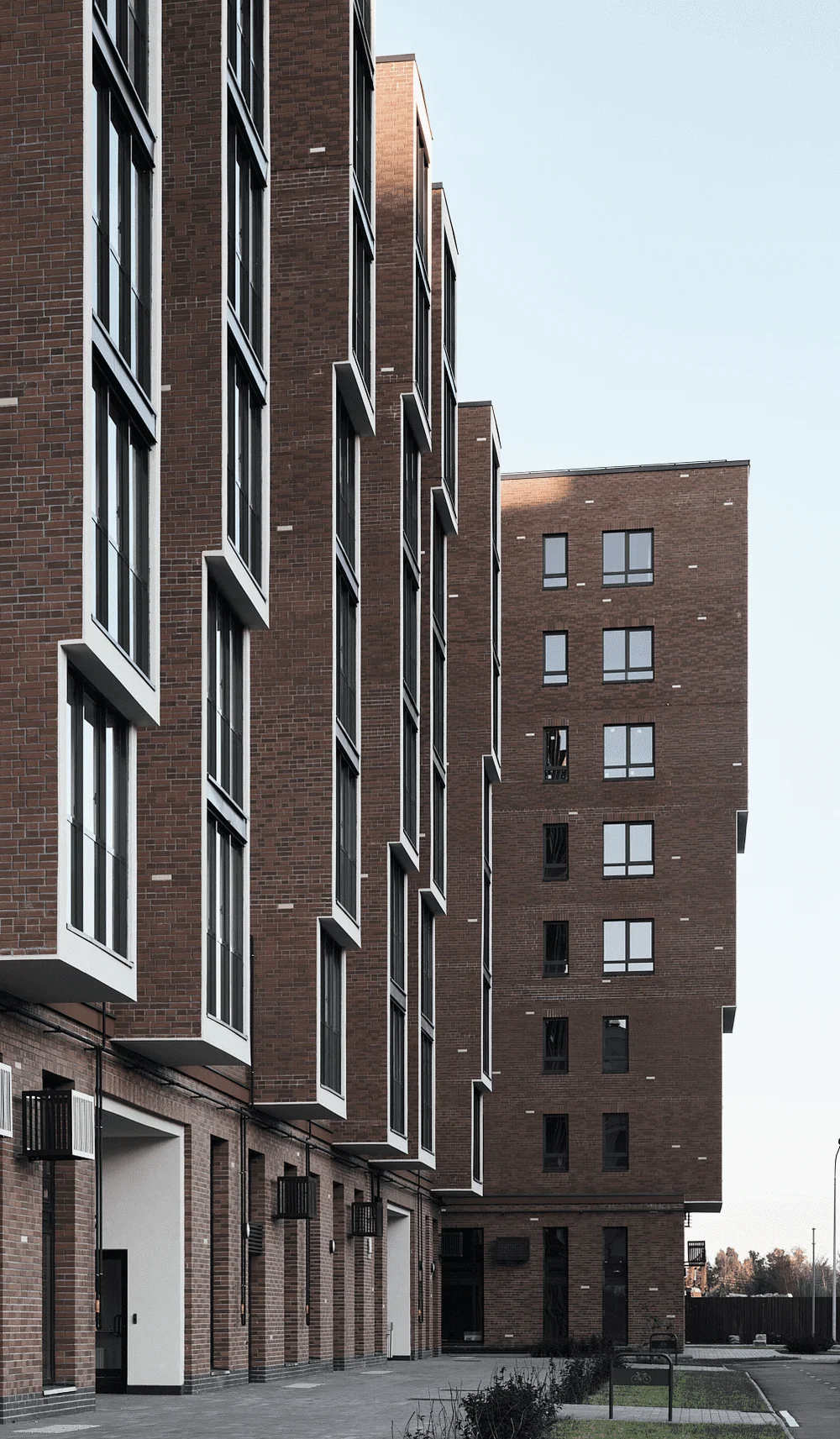 Пластика фасада выявлена за счёт фактуры отделочного материала: клинкерная плитка с текстурой кирпича, устанавливаемого на подсистему.