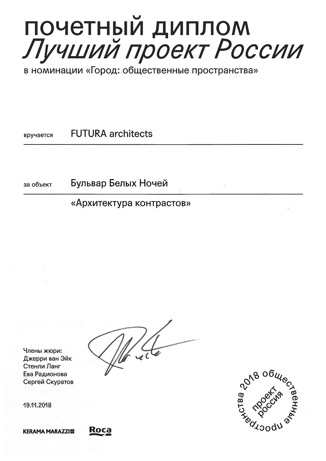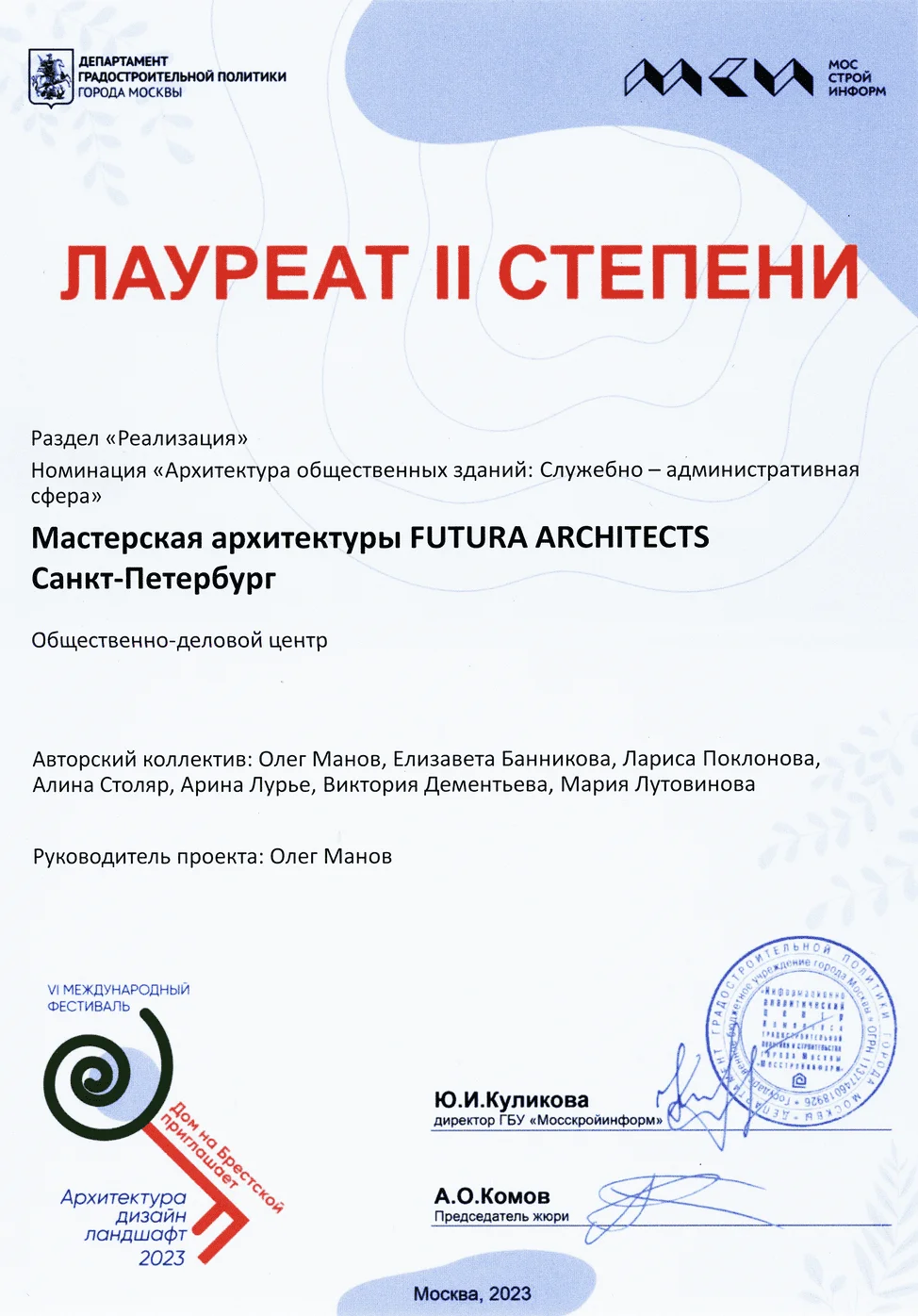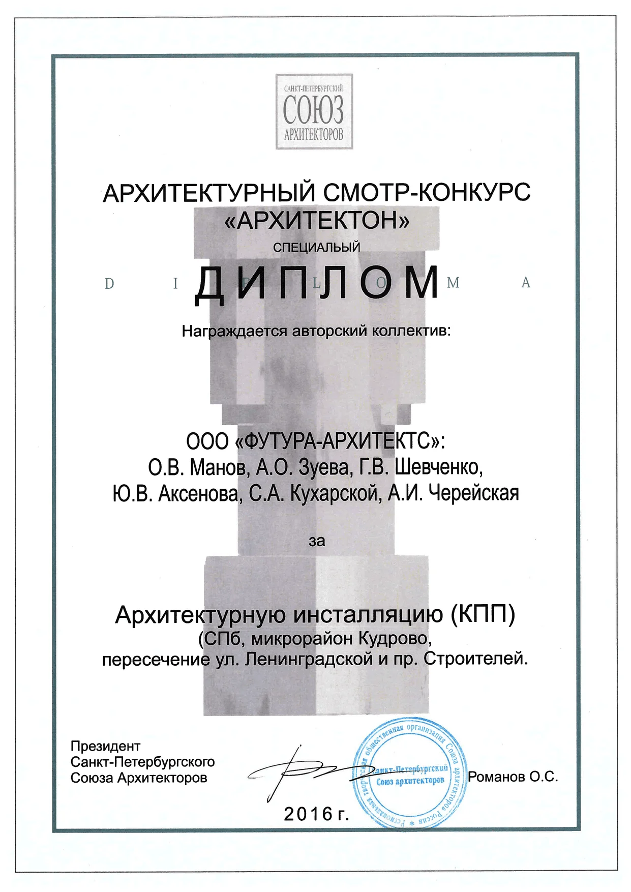 Архитекторы: Е. Саенко, Л. Поклонова, Ю. Манова, М. Пересада, А. Столяр, А. Смирнов, Ю. Зиновьева, Е. Галахова
