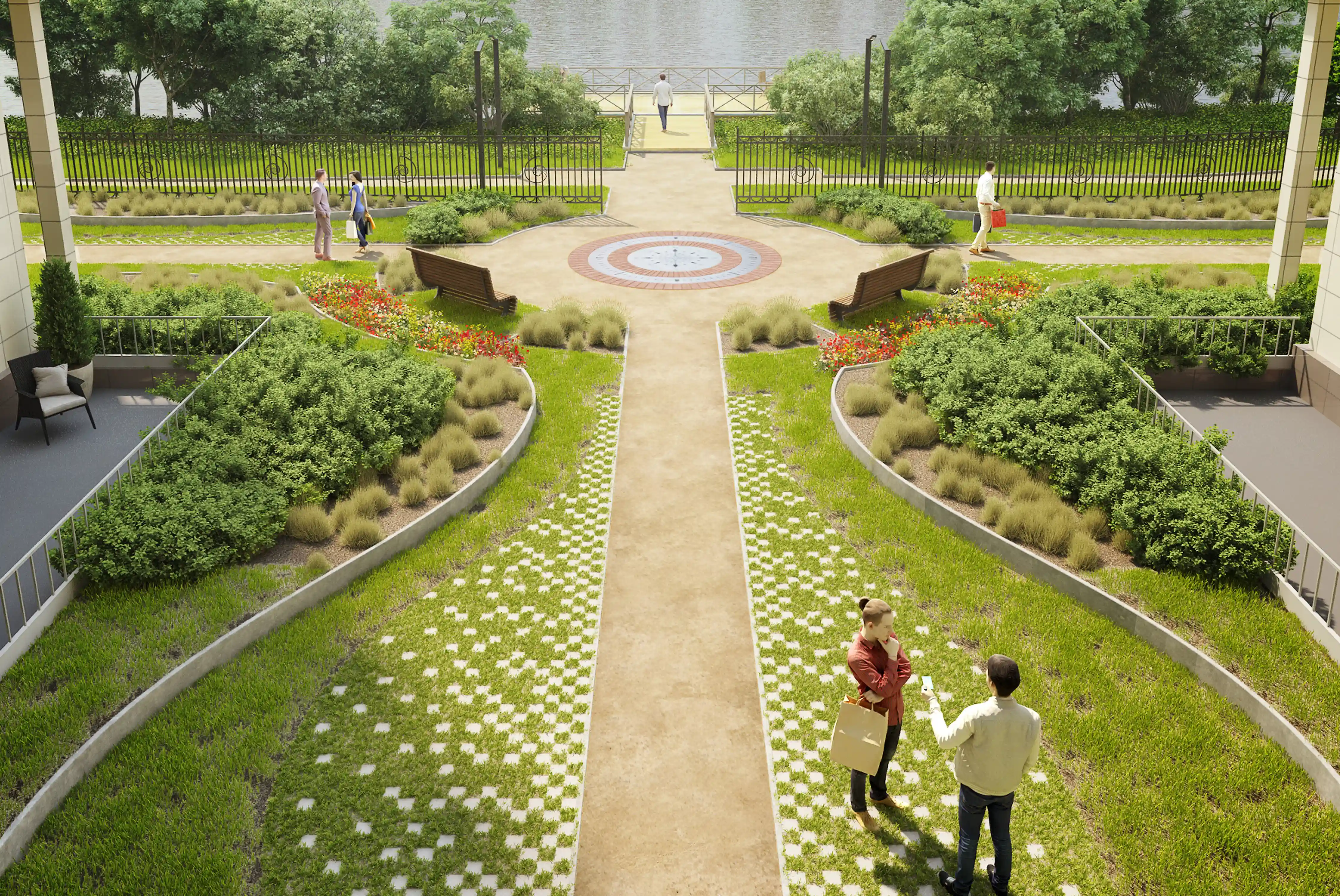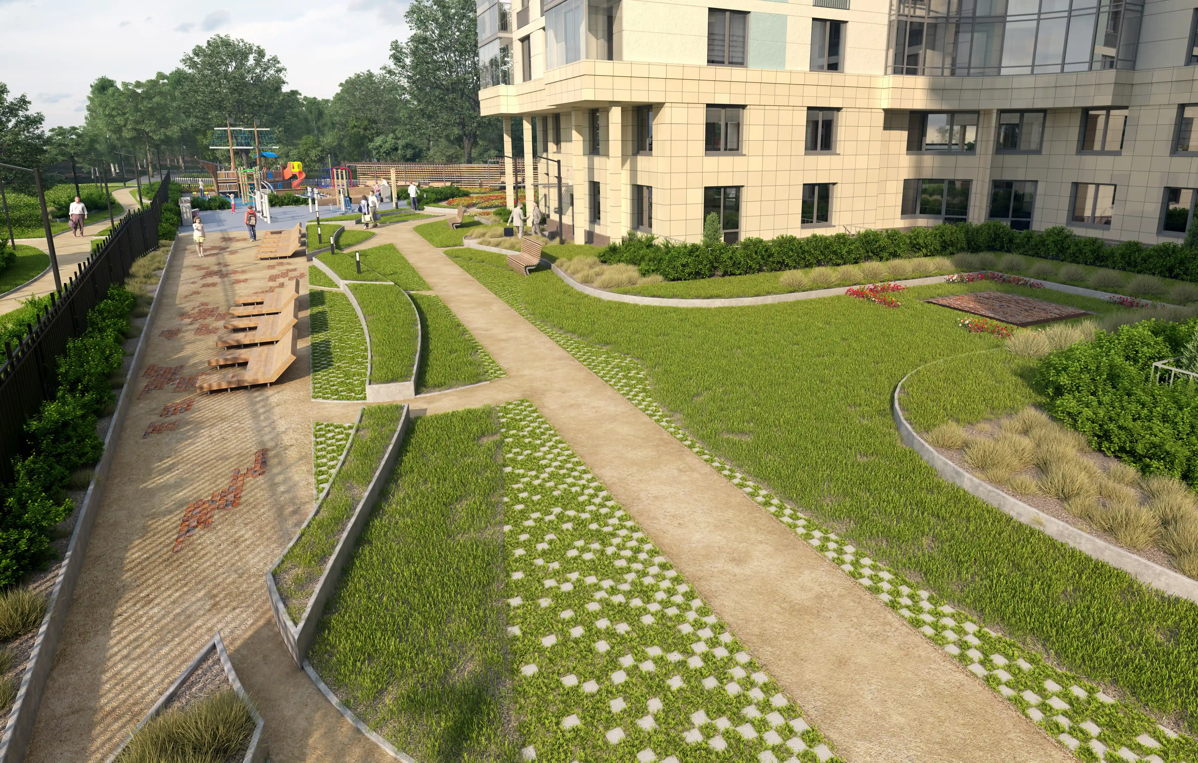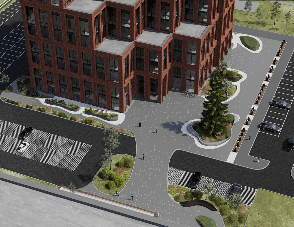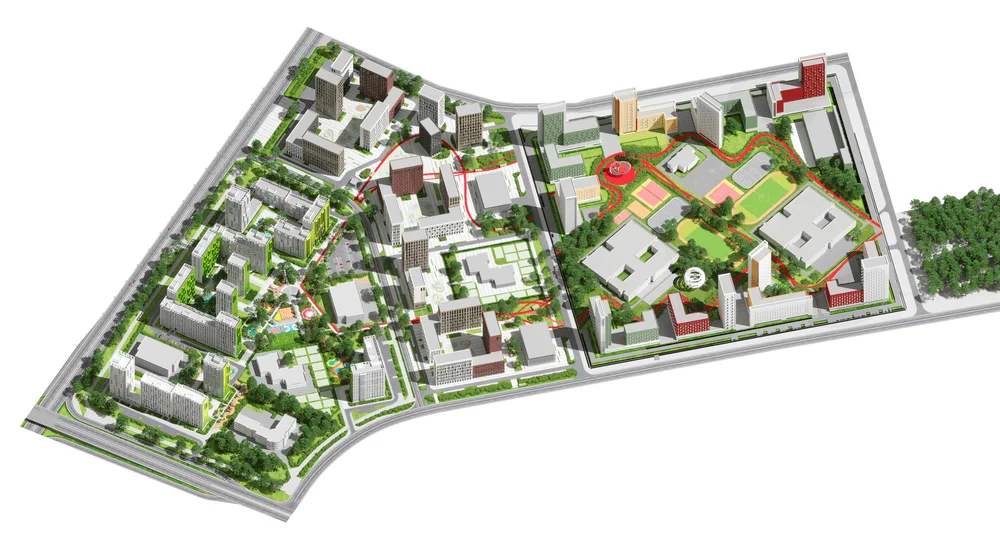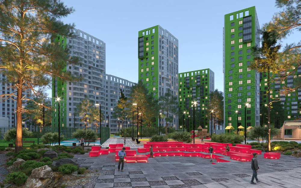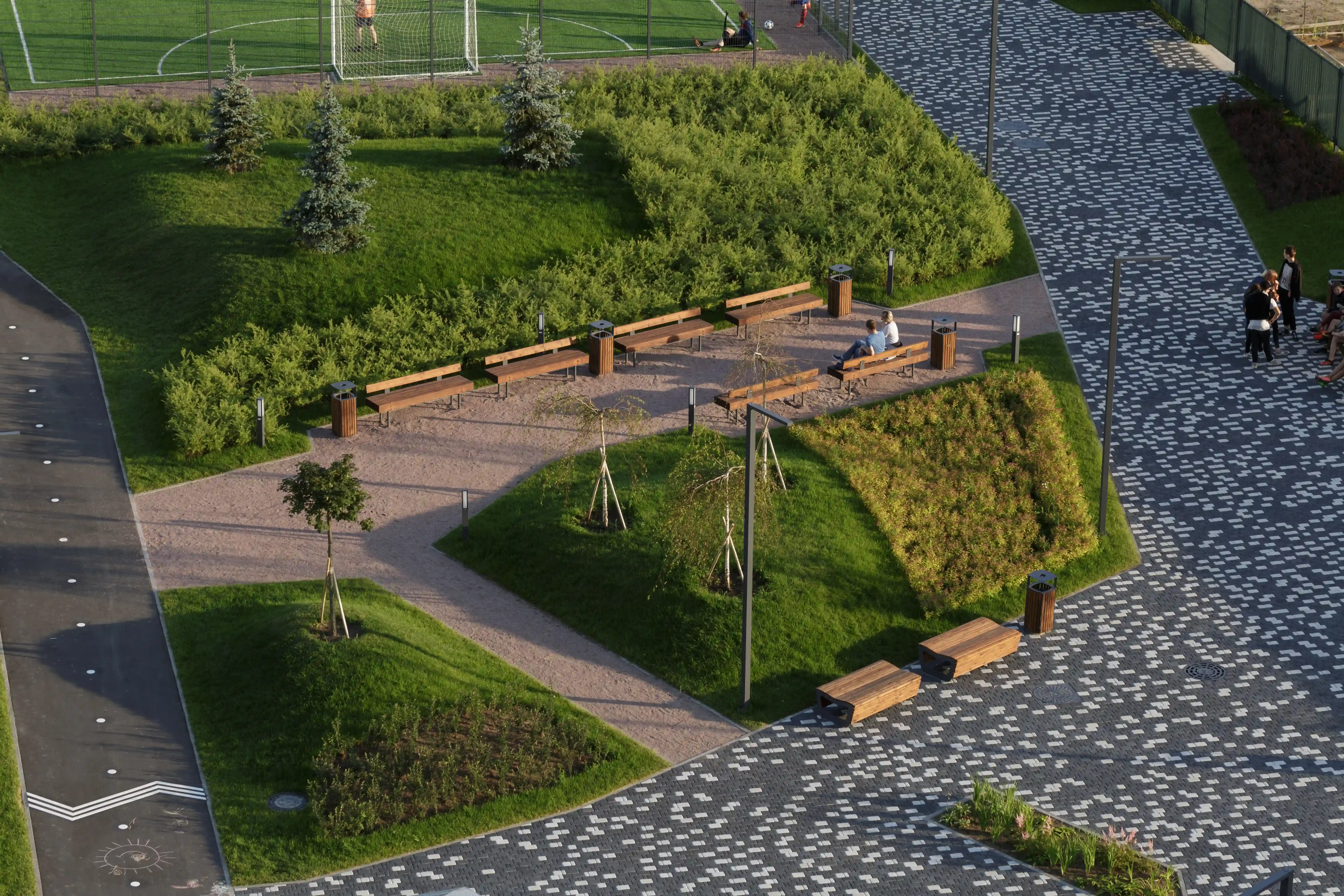 Проект включает ландшафтное озеленение, устройство променада, велодорожки, установку скамеек и беседок. Через весь квартал пройдет променад протяжённостью 340 м, который начнется спортивной площадкой и закончится зоной отдыха. Концепция предполагает движение по внутриквартальному пространству от одной точки притяжения к другой, таким образом, создав тематические прогулочные маршруты, а также позволит сбить монотонность движения и создать эффект природной среды. Основными точками притяжения запланированы центральная площадь, березовая.