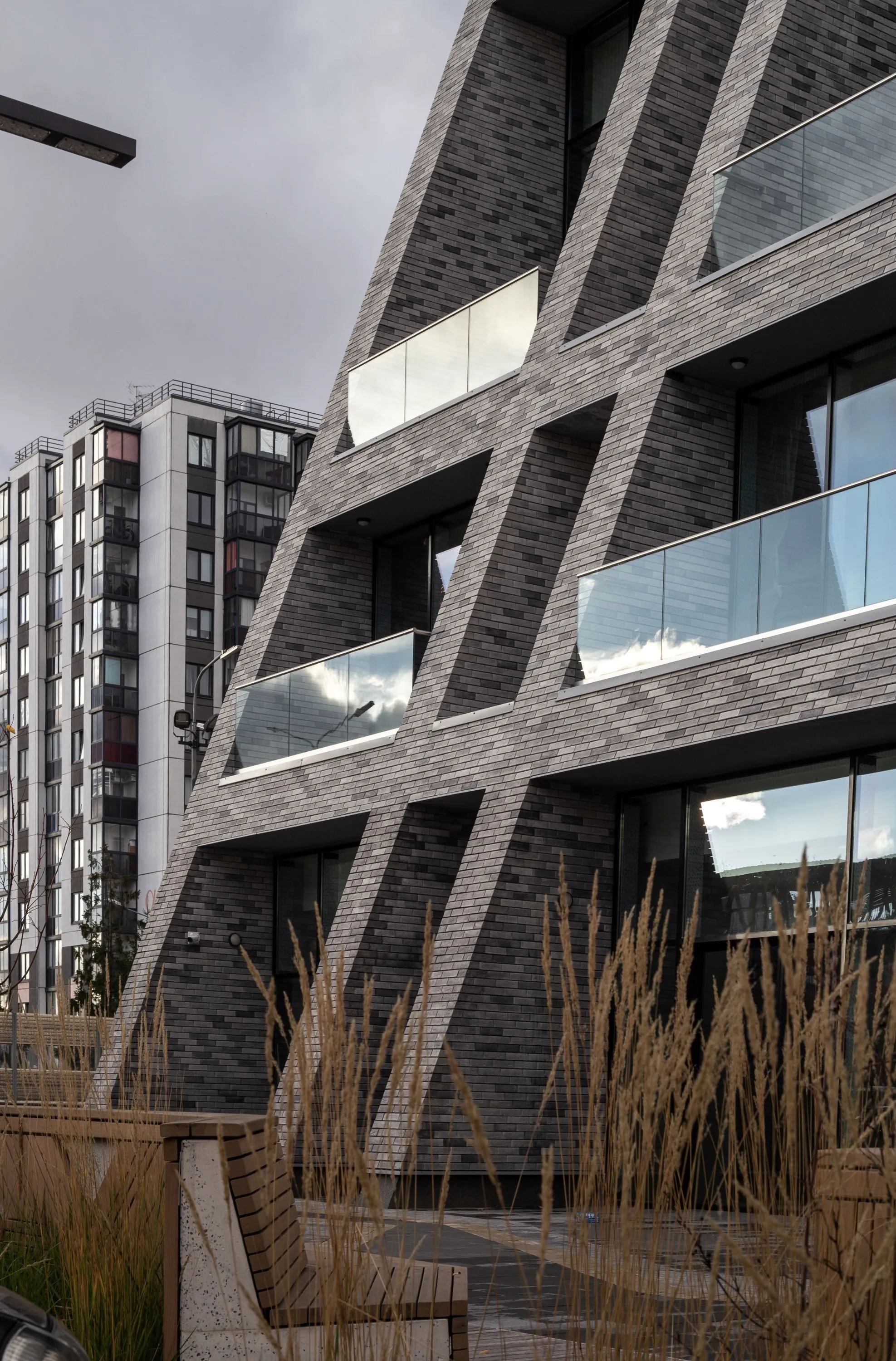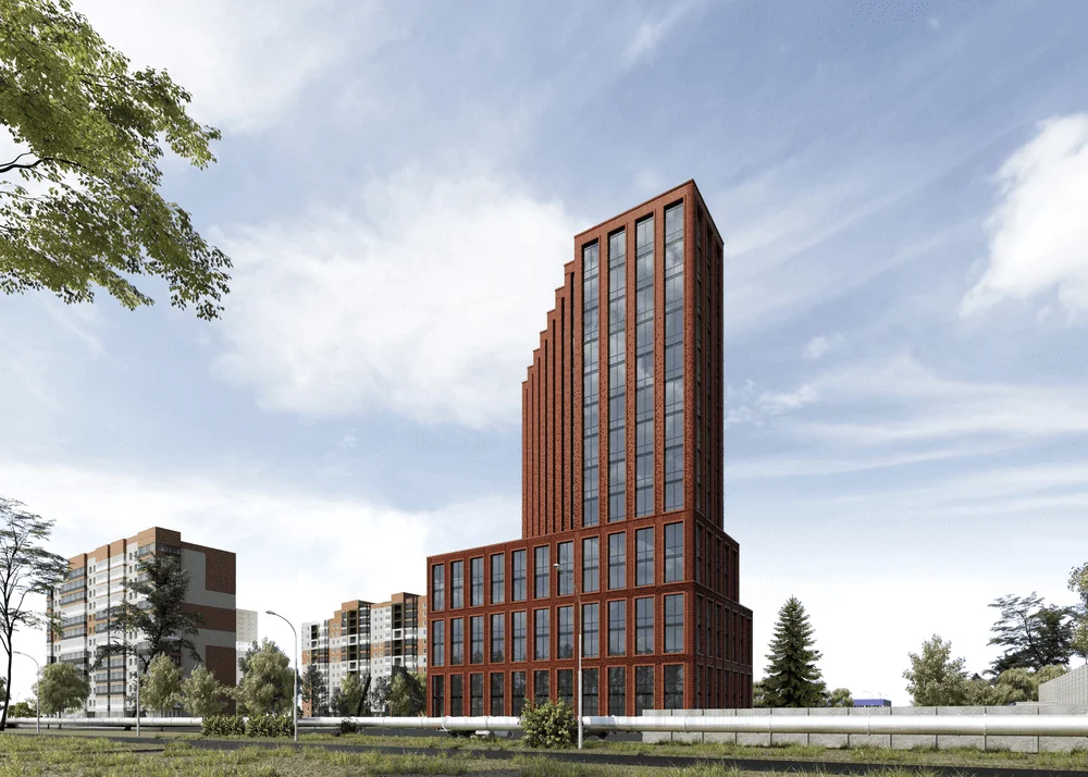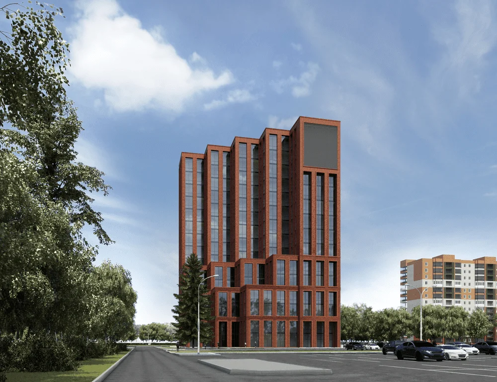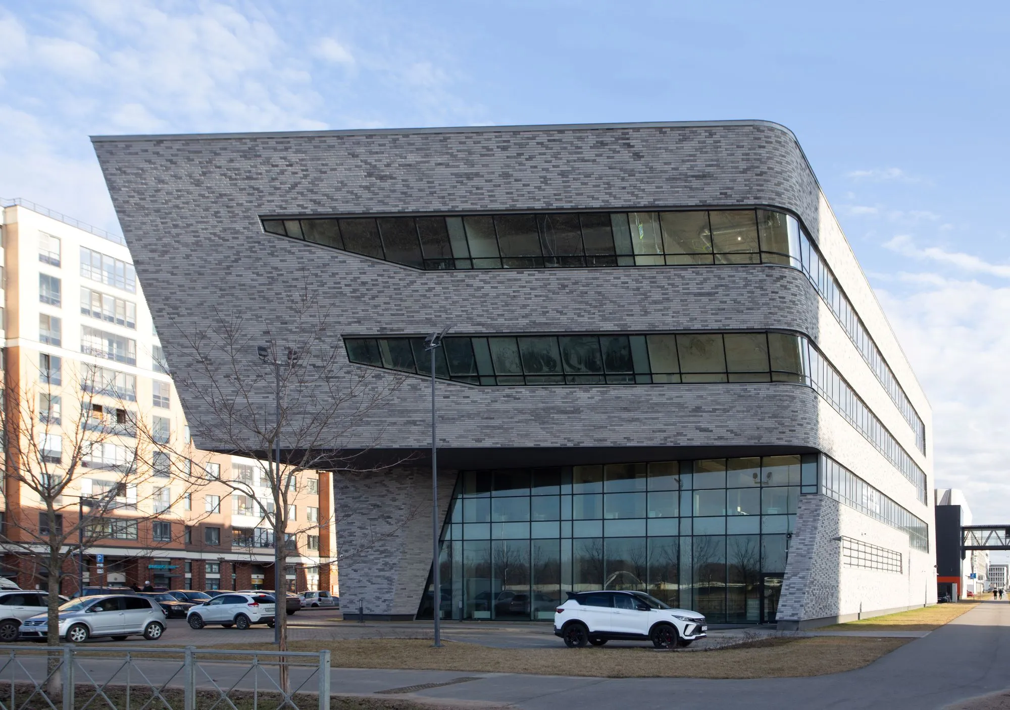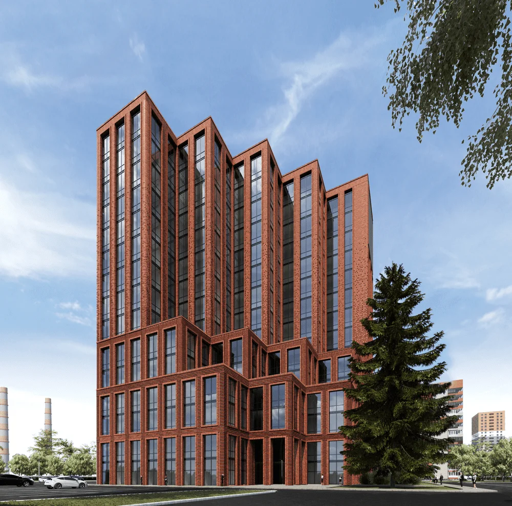 С другой стороны, форма здания местами больше имеет некоторые особенности транспортного дизайна, чем отсылает нас к стилю Streamline середины прошлого века. Это связано больше не с местом, а с желанием клиента подчеркнуть его амбициозность и динамизм. Здание в основном будет восприниматься на расстоянии 100-200 метров со стороны развязки, и в этом случае форма здания становится важнее, чем его детали и текстура. С более близкого расстояния его мало кто будет воспринимать, так как все пешеходные маршруты проходят далеко за ним. Но, тем не менее, даже с более близкого расстояния есть большое отличие от типовой застройки – облицовка под кирпич, угловые элементы, верхнеподвесные окна с зауженным профилем, мелкая расстекловка.