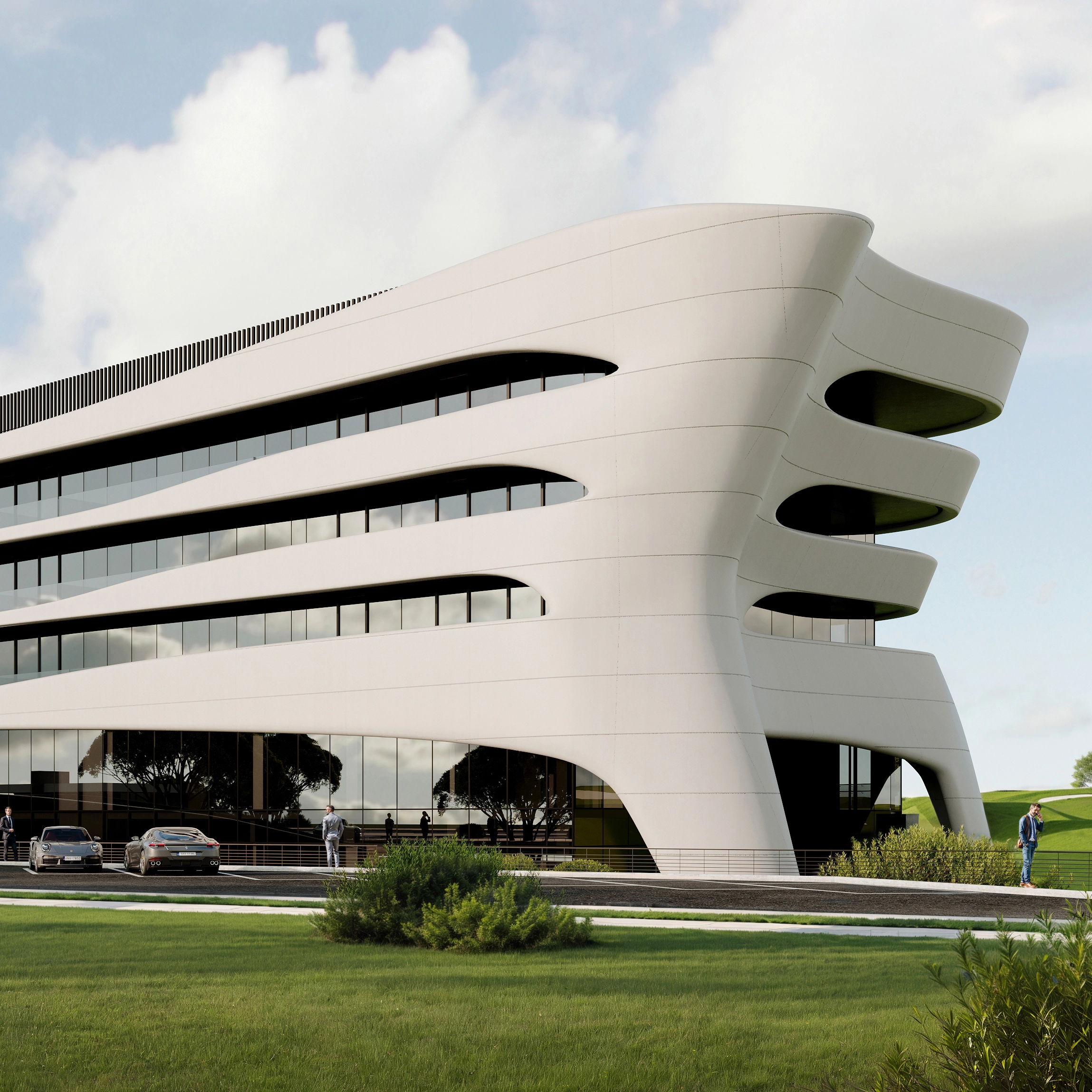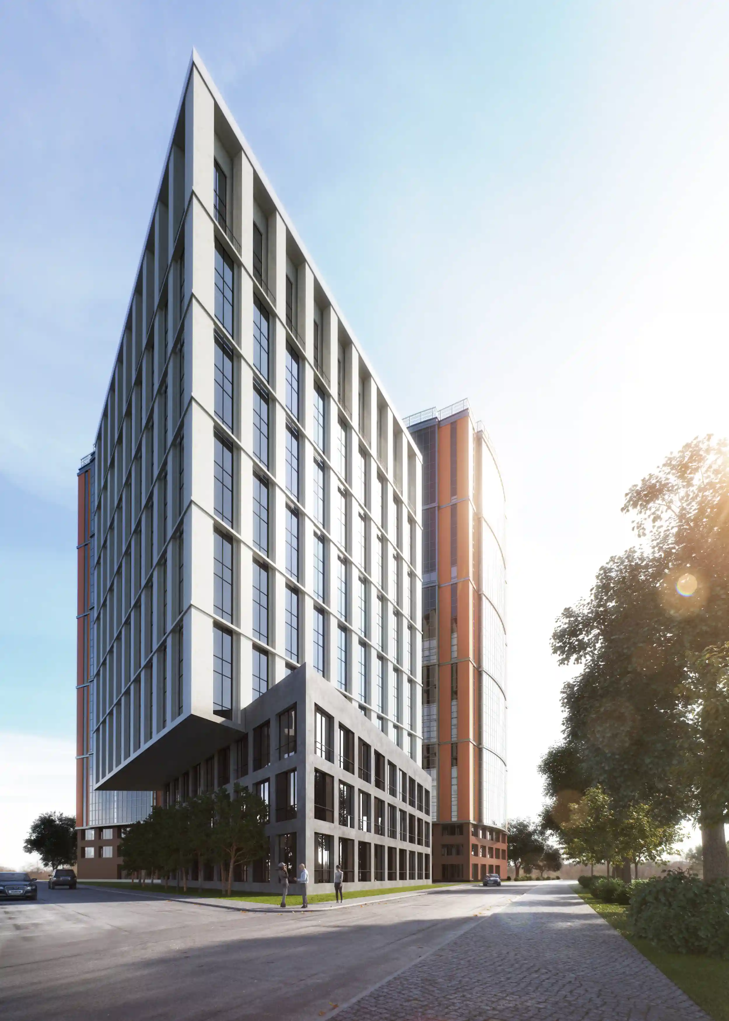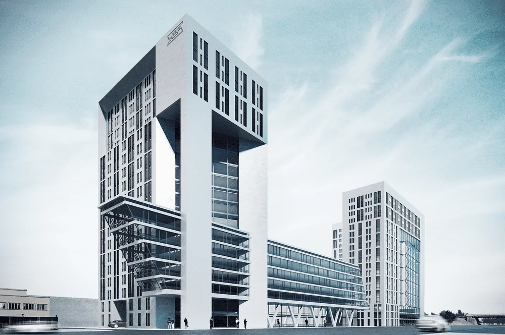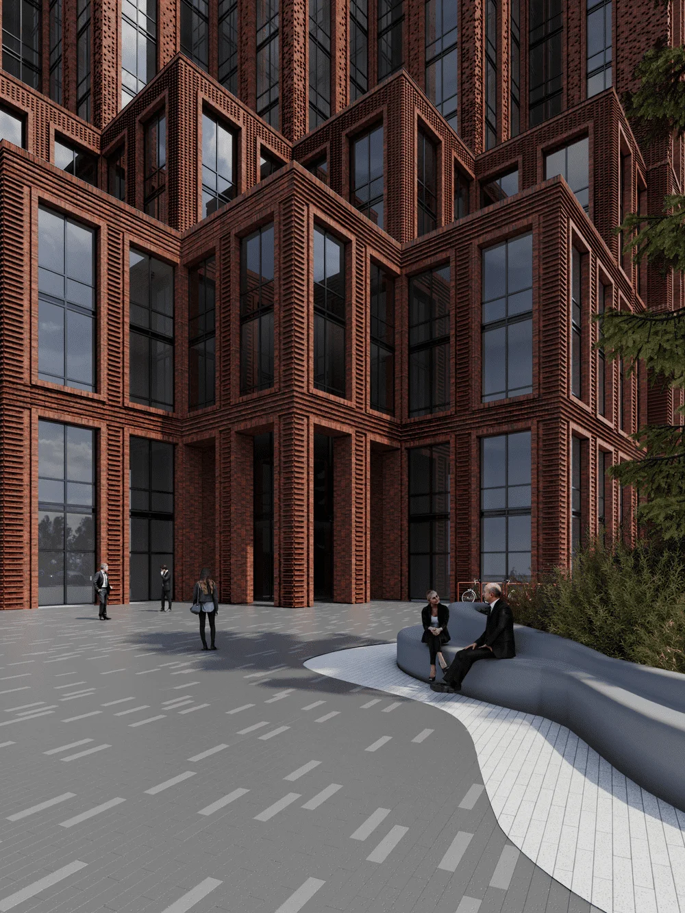 С другой стороны, форма здания местами больше имеет некоторые особенности транспортного дизайна, чем отсылает нас к стилю Streamline середины прошлого века. Это связано больше не с местом, а с желанием клиента подчеркнуть его амбициозность и динамизм. Здание в основном будет восприниматься на расстоянии 100-200 метров со стороны развязки, и в этом случае форма здания становится важнее, чем его детали и текстура. С более близкого расстояния его мало кто будет воспринимать, так как все пешеходные маршруты проходят далеко за ним. Но, тем не менее, даже с более близкого расстояния есть большое отличие от типовой застройки – облицовка под кирпич, угловые элементы, верхнеподвесные окна с зауженным профилем, мелкая расстекловка.