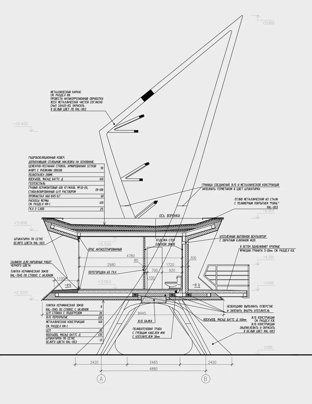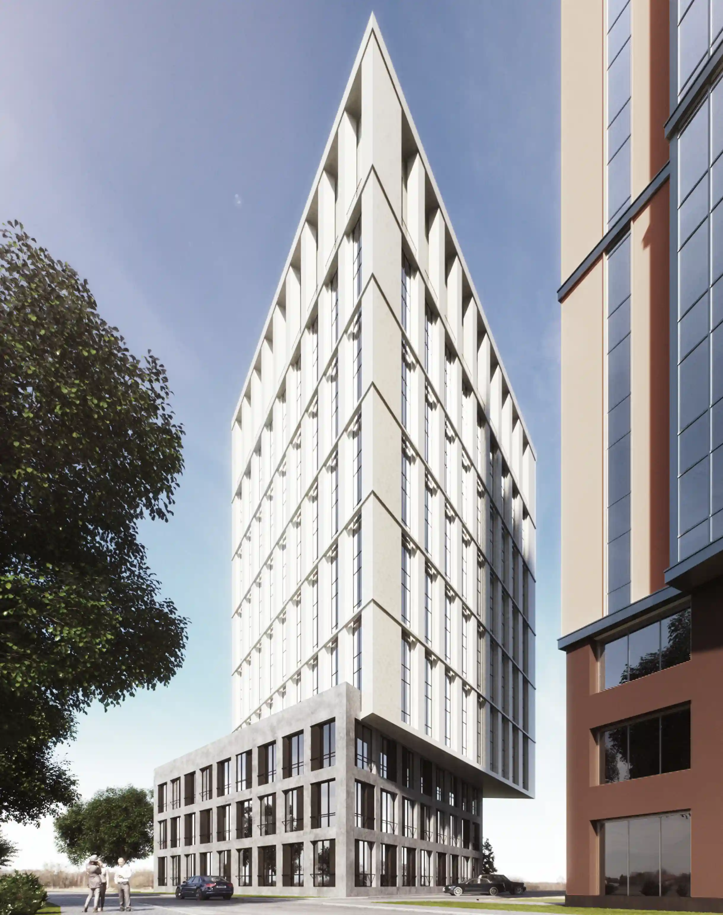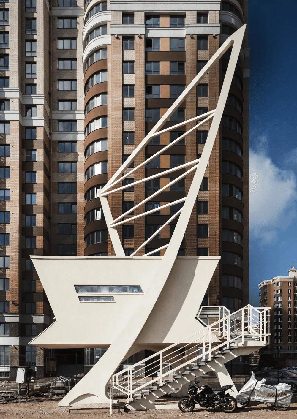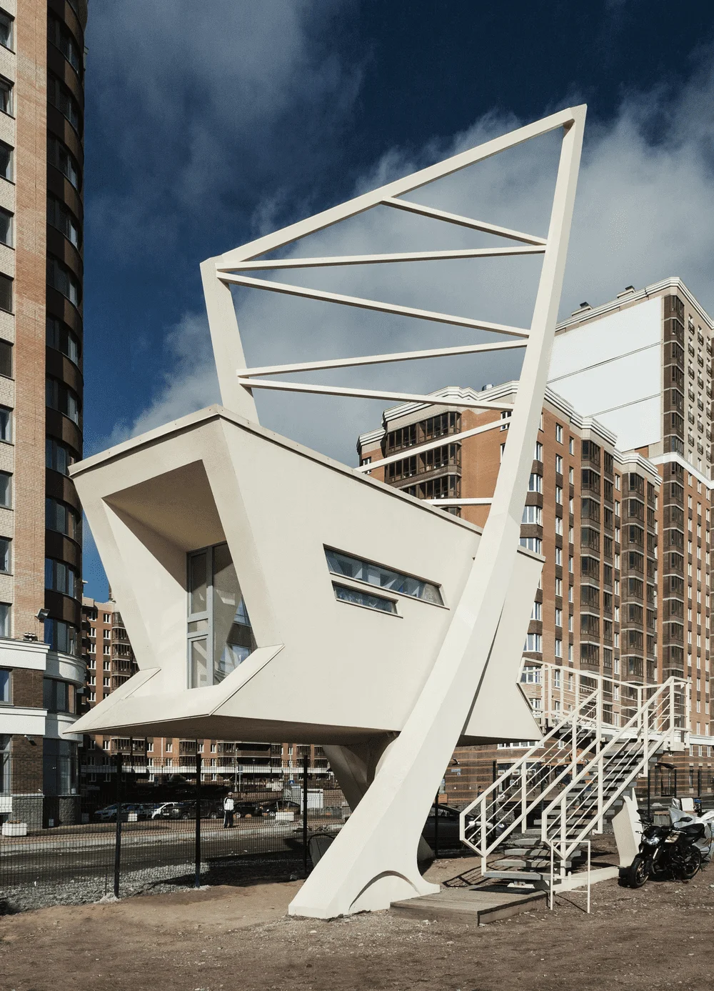 Бизнес-центр выполнен в виде параллелепипеда с наклоном в сторону КАД, что придает внутреннюю напряженность формы и внешнее сходство с кораблем.