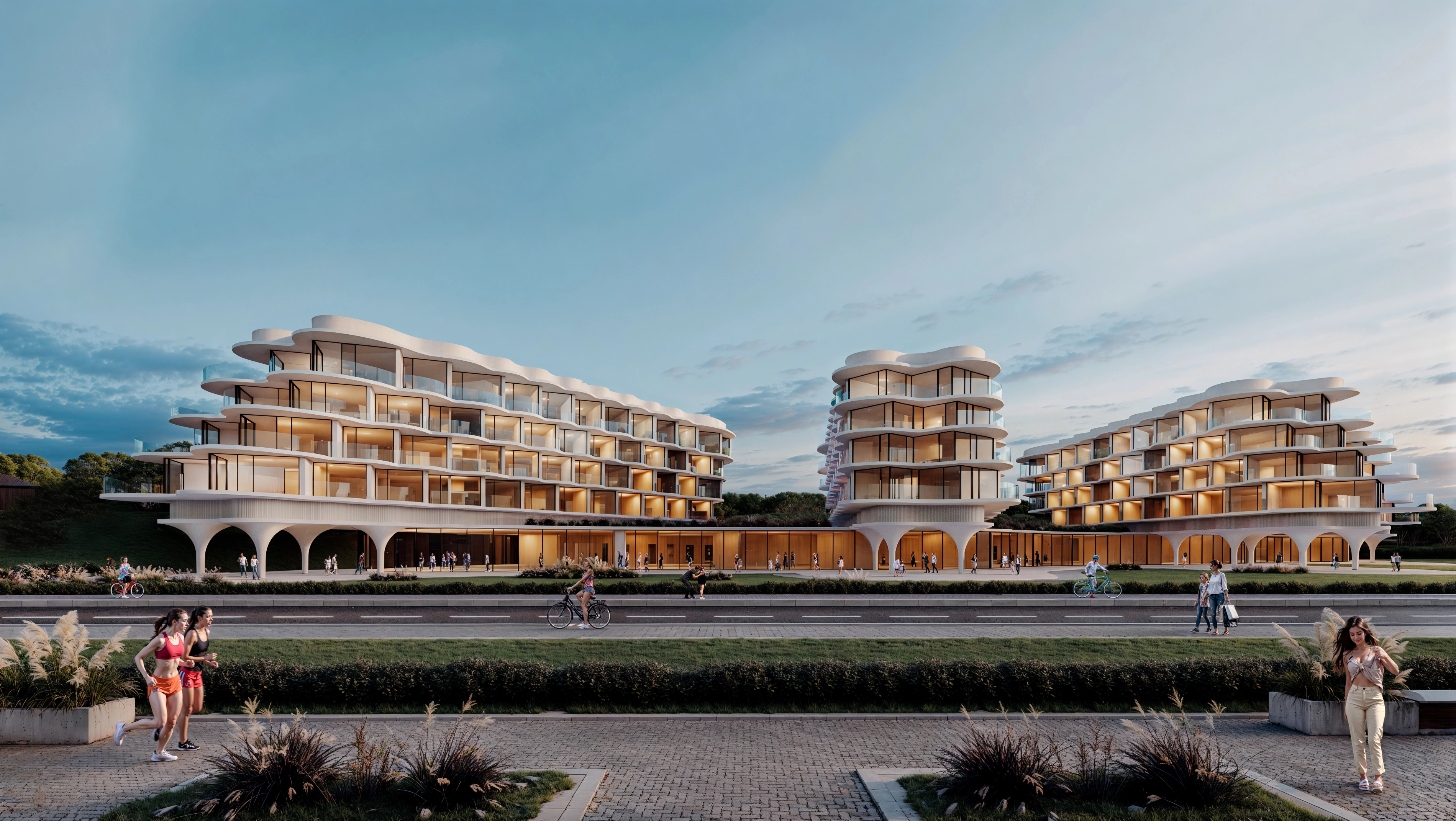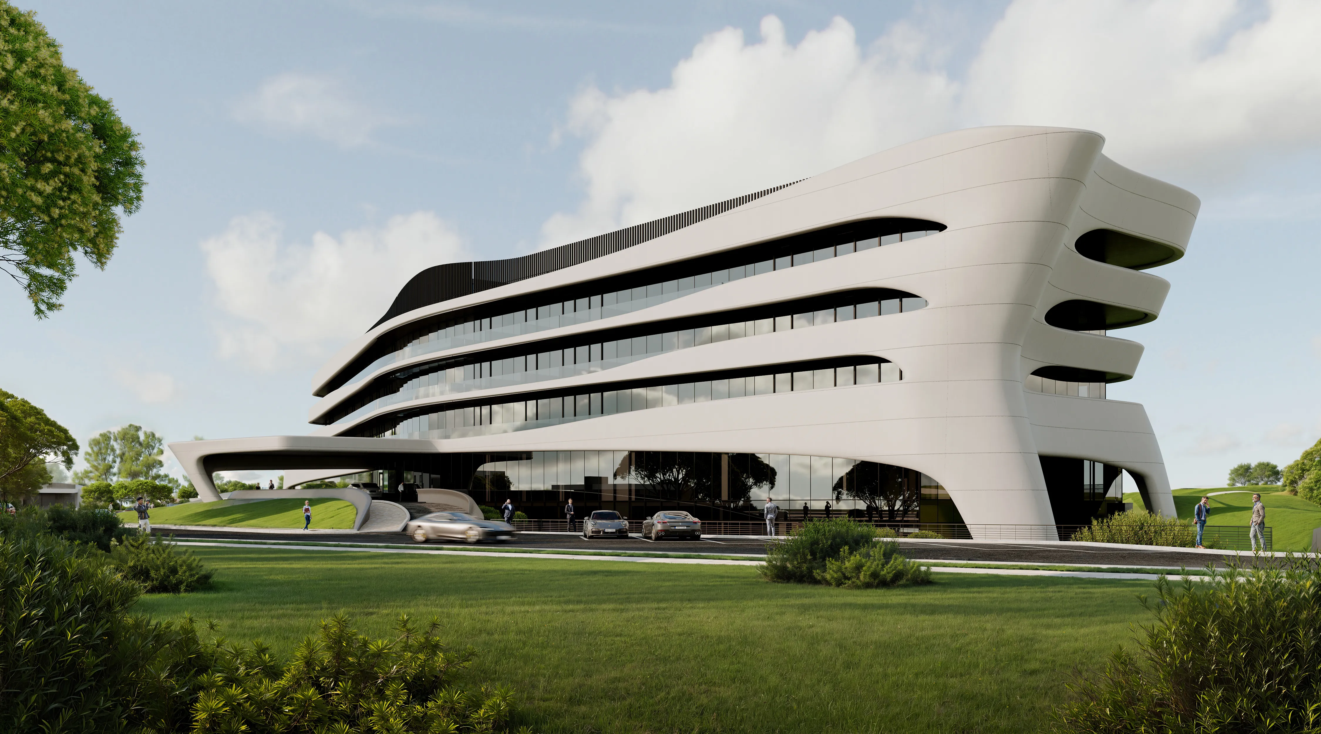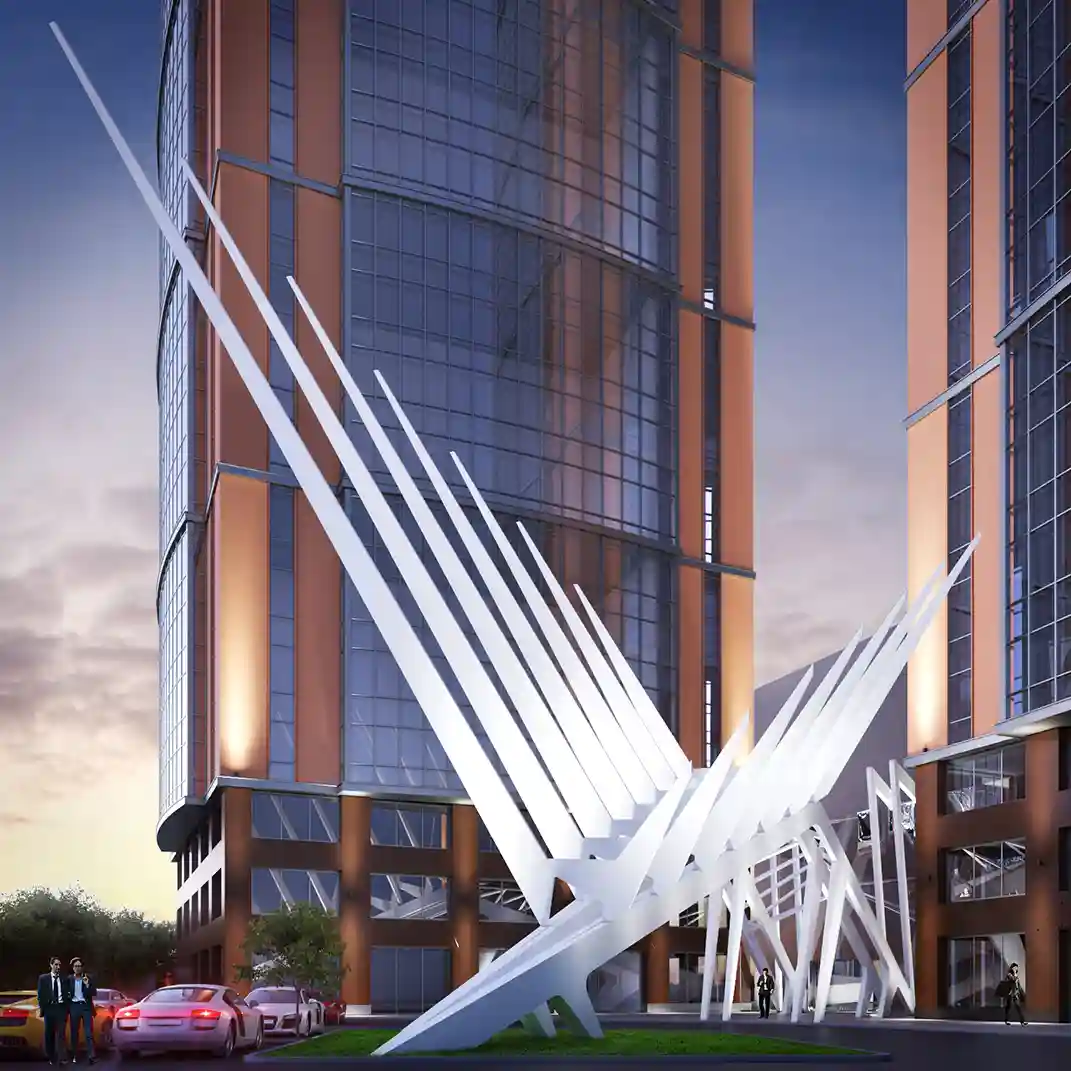 Здания и сооружения комплекса выполнены в стиле био-тек в белом цвете, что отсылает к морскому стилю. Корпуса набраны фрактальной структурой, что придает зданию ажурность и легкость. Колонны имеют бионическую форму, создавая ощущение, что они вырастают из земли.