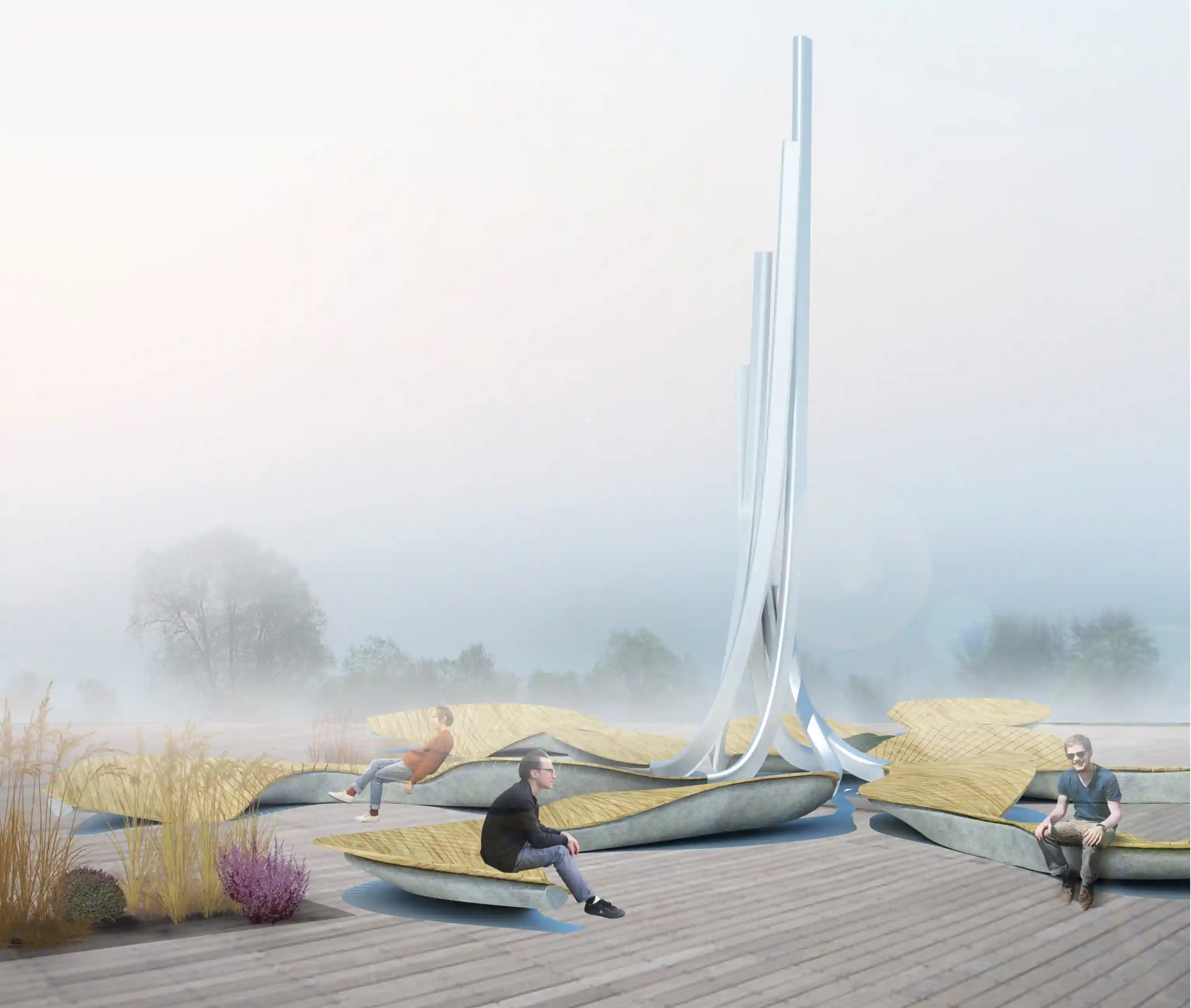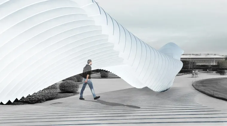 Инсталляция «Волна» играет роль встречающей композиции, разорванной в центре таким образом, чтобы сквозь решетчатую современную форму проступал Большой Петергофский дворец. Линейная структура имеет сложную конфигурацию, за счет этого объект не смотрится статичным, а раскрывается с разных ракурсов. Элементы предлагается выполнить из фанеры, общая длина двух структур – 100м. Тема фонтанов в инсталляции получает новое звучание.