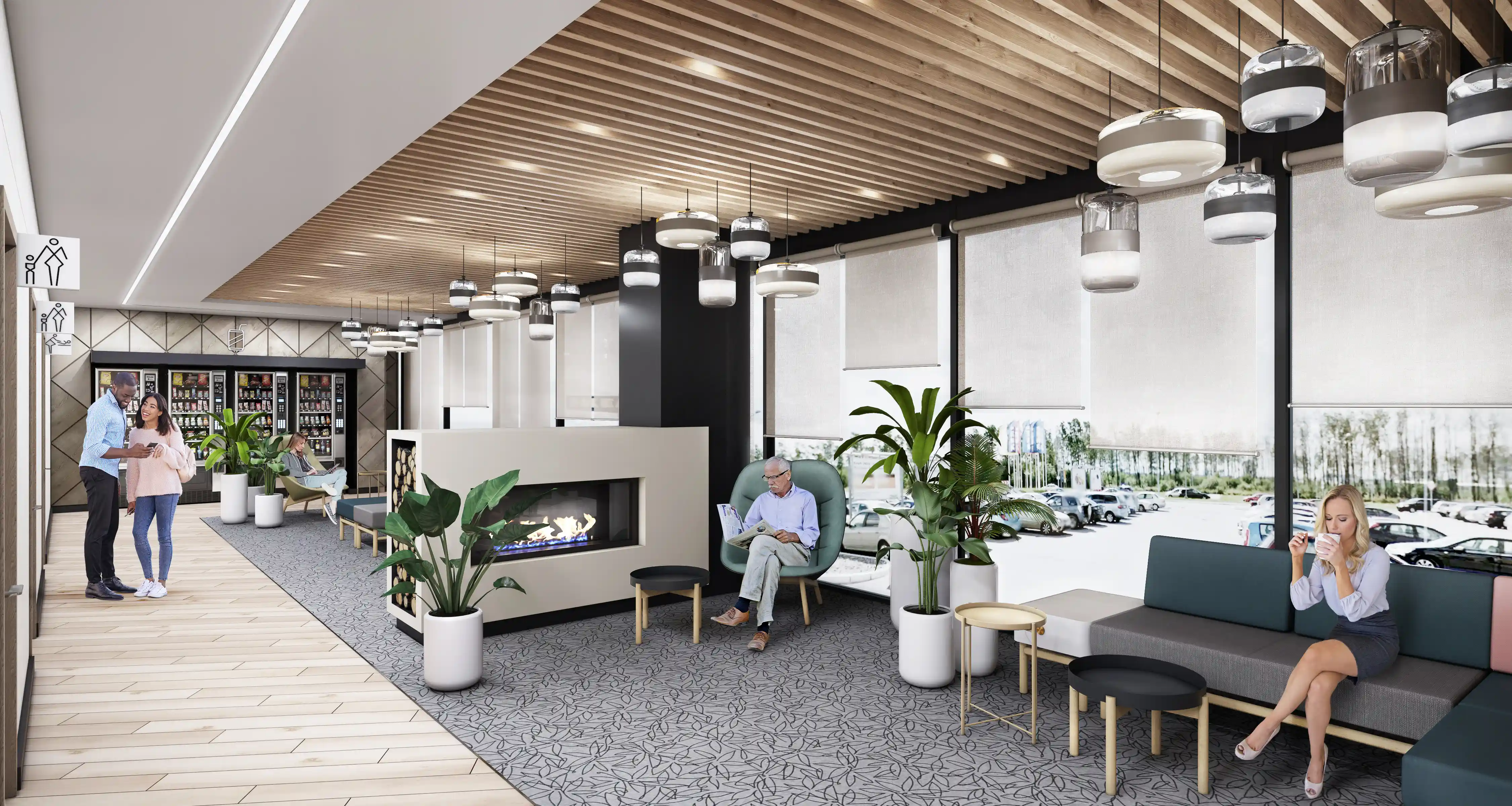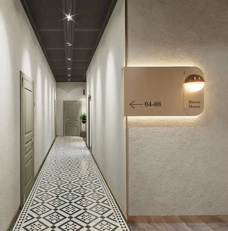 Горизонтальные линии ленточного остекления гостиничного-оздоровительного комплекса углублены относительно основной плоскости, образуя балконы и создавая выразительный светотеневой эффект. Для облицовки наружных стен выбраны стеклофибробетон и керамогранит. Медицинско-оздоровительный центр разместится на нижних уровнях правого крыла здания, первый и второй этаж с левой стороны займут конференц-зал, помещения ресторана, административные и технические помещения. На верхних этажах запроектировано 103 номера для проживания 233 человек.