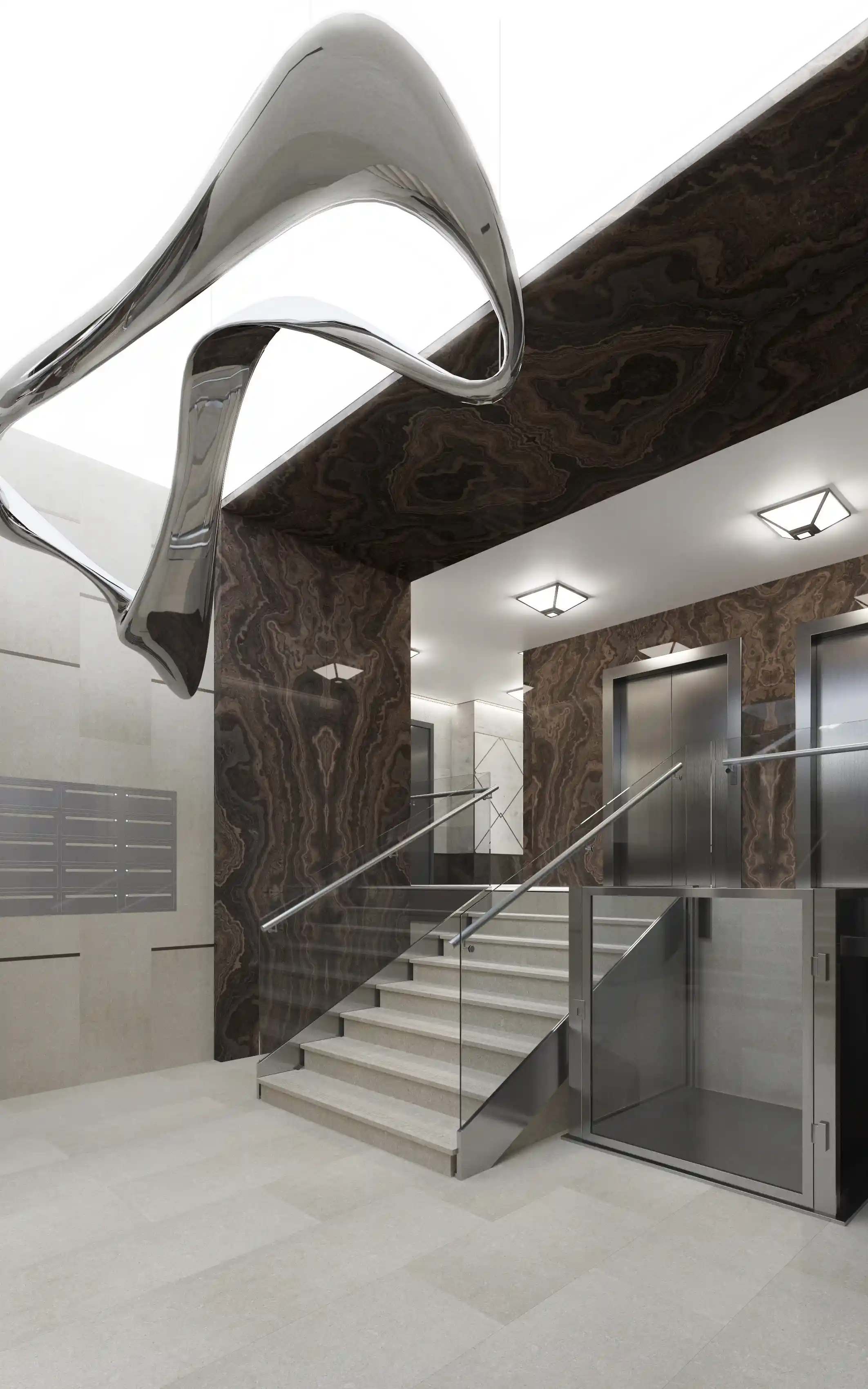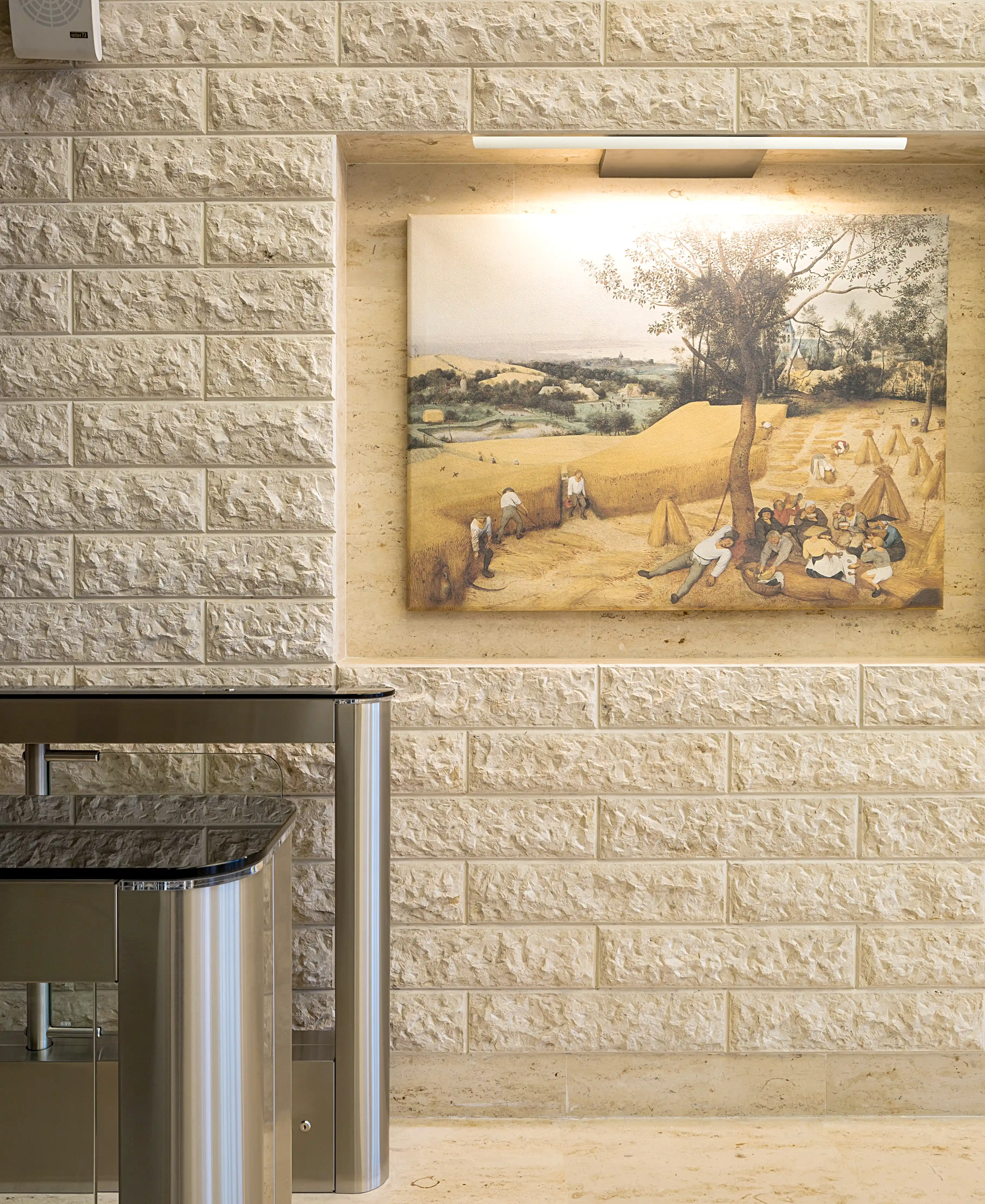 В редкие солнечные дни между ламелями проникают тонкие лучи света, создавая сложную и неповторимую световую инсталляцию, проникающую внутрь здания.