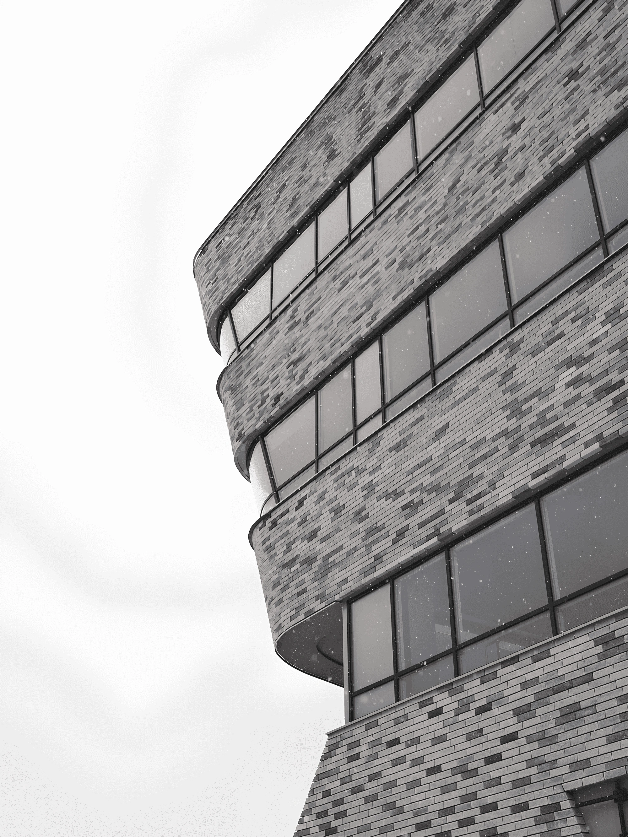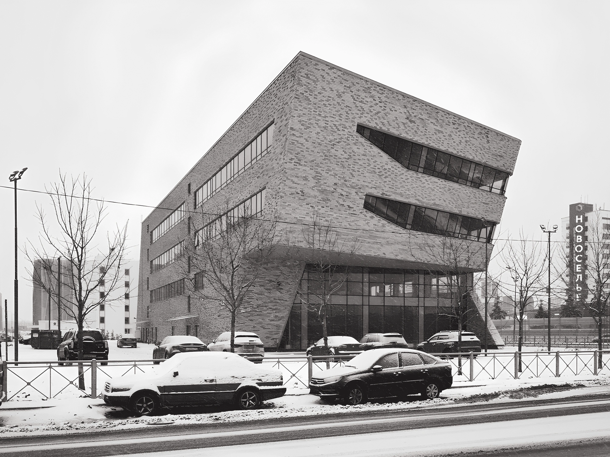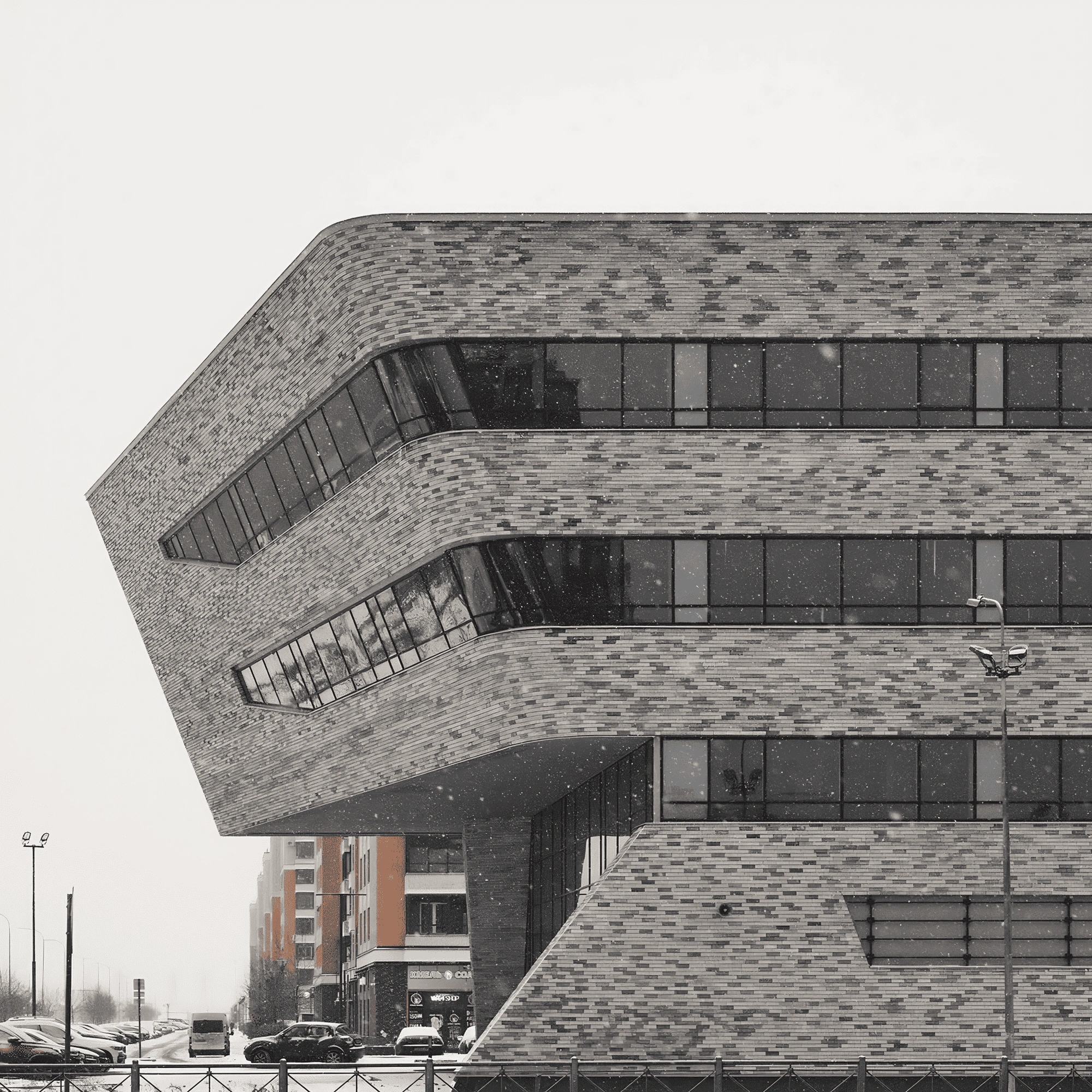 Терракотовый цвет, ясные простые формы эркеров, облицованные кирпичом и рандомное расположение белых кирпичей на фасаде, напоминающих падающий снег, позволило оторвать объект от контекста и сделать его более заметным и более дерзким.