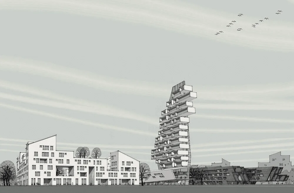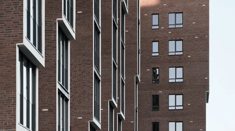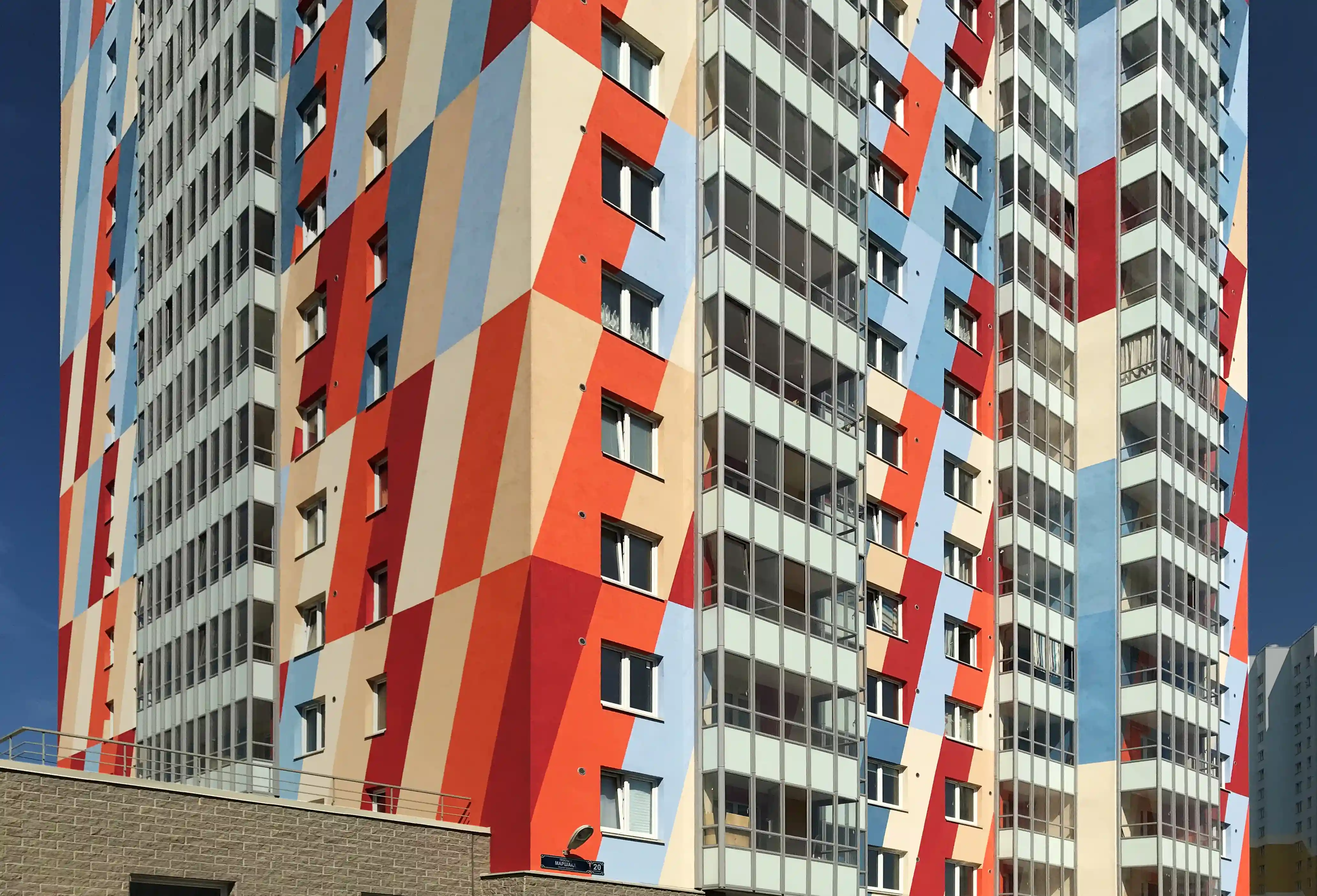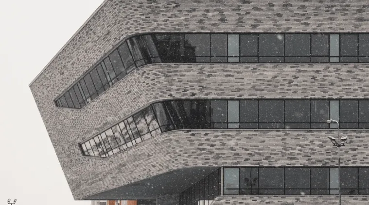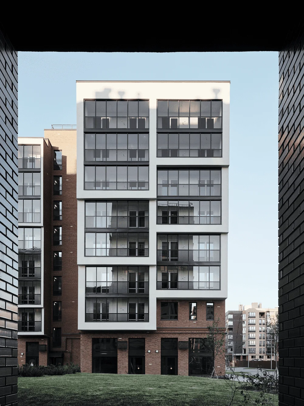 Терракотовый цвет, ясные простые формы эркеров, облицованные кирпичом и рандомное расположение белых кирпичей на фасаде, напоминающих падающий снег, позволило оторвать объект от контекста и сделать его более заметным и более дерзким.