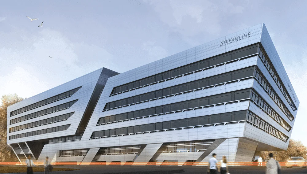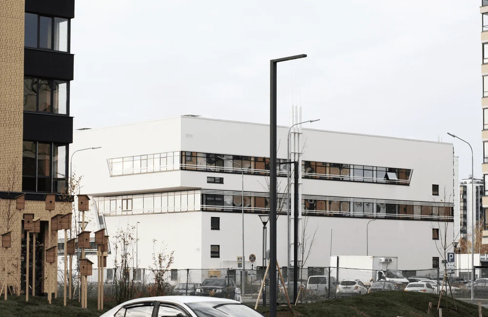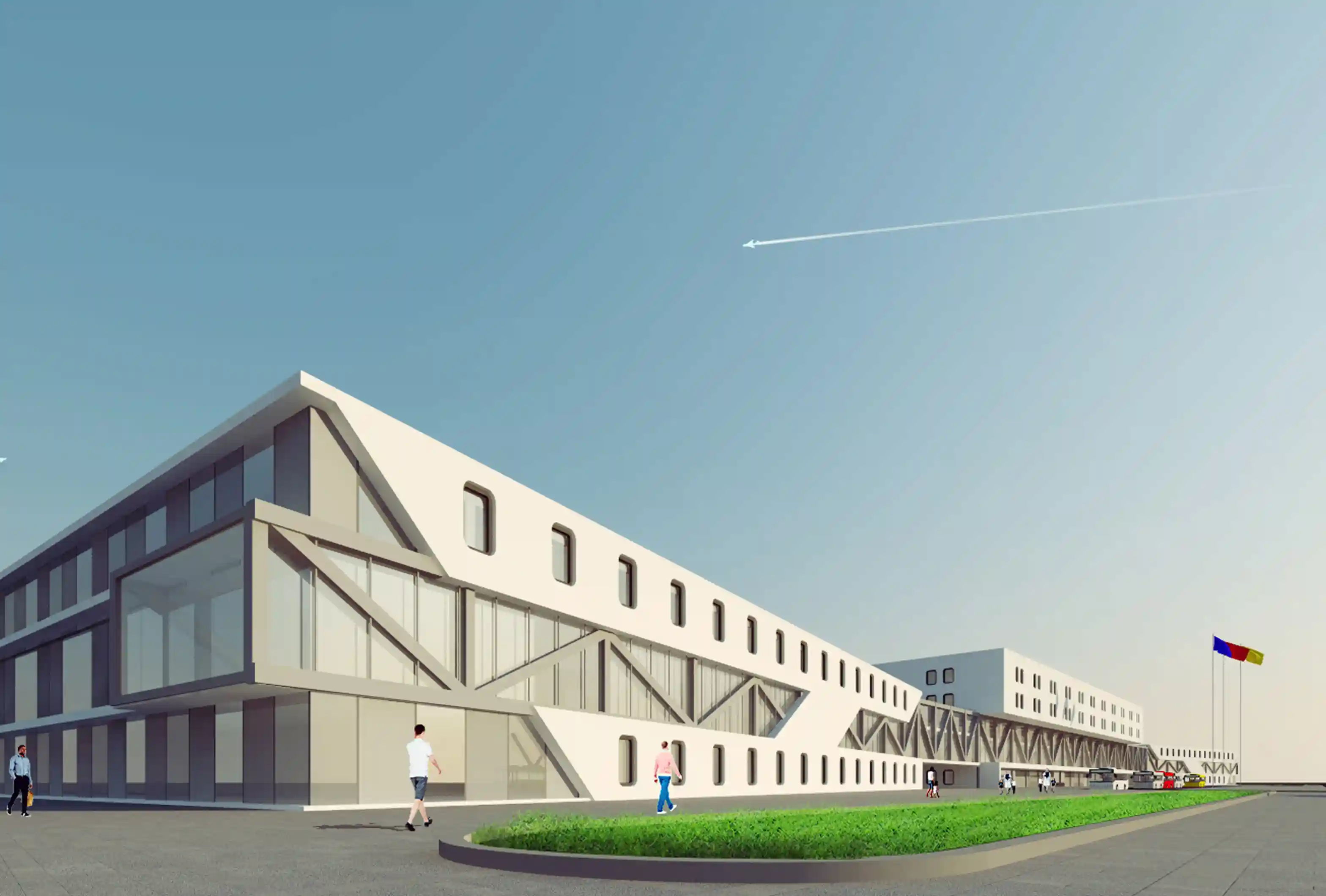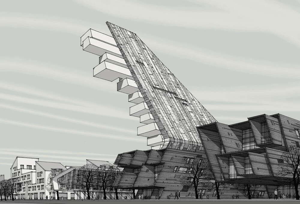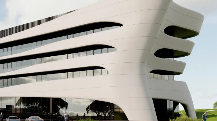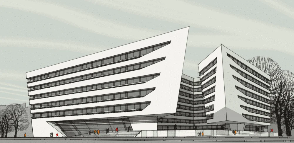 Здание представляет собой прямоугольный в плане объём с характерным активным горизонтальным акцентом – консольным выносом и динамичным наклоном плоскостей стен со стороны главного входа в здание. Форма здания выполнена в максимально лаконичных объёмах. Все основные функциональные блоки выделены витражным остеклением. Для придания архитектурному образу динамичности в фасадных членениях использованы наклонные линии.