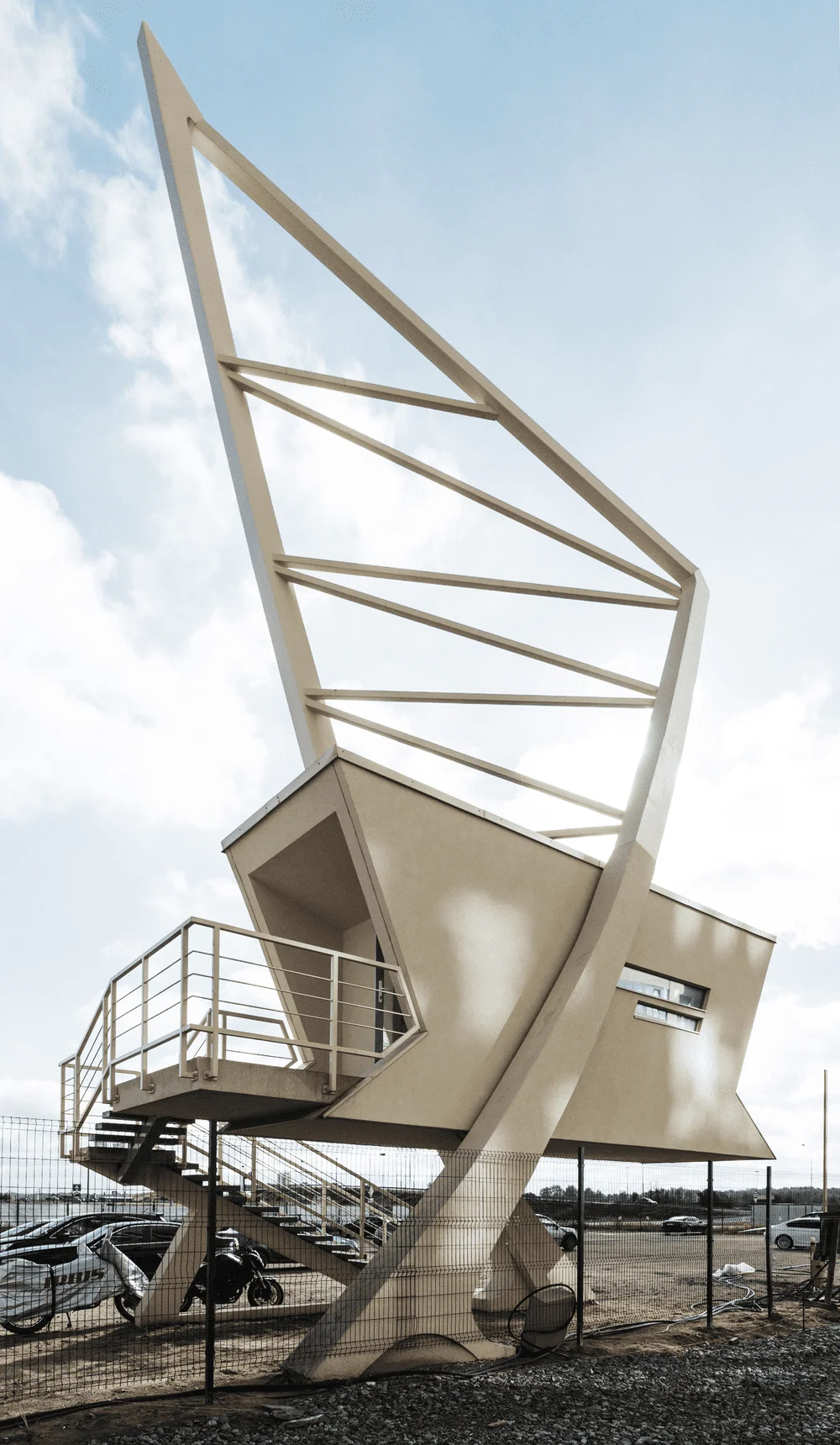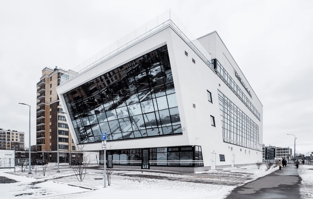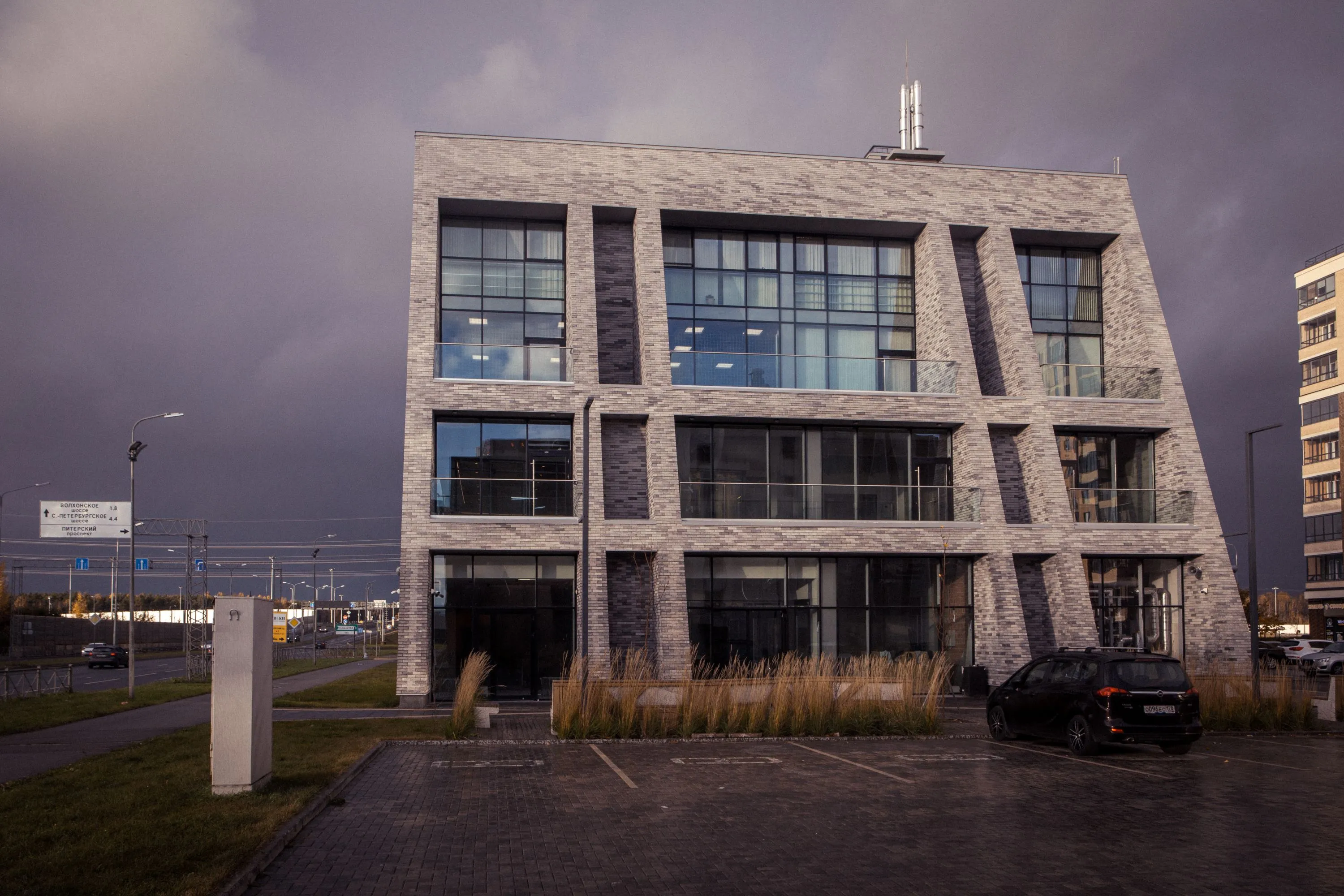 Здание расположено на выезде из Санкт-Петербурга. В его стилистике, с одной стороны, отражается любовь заказчика к финской модернистской архитектуре, а с другой – ясный и лаконичный силуэт контрастирует с внутренним динамизмом и напряжением, создаваемым множеством монолитных плоскостей, нависающих над главным входом.