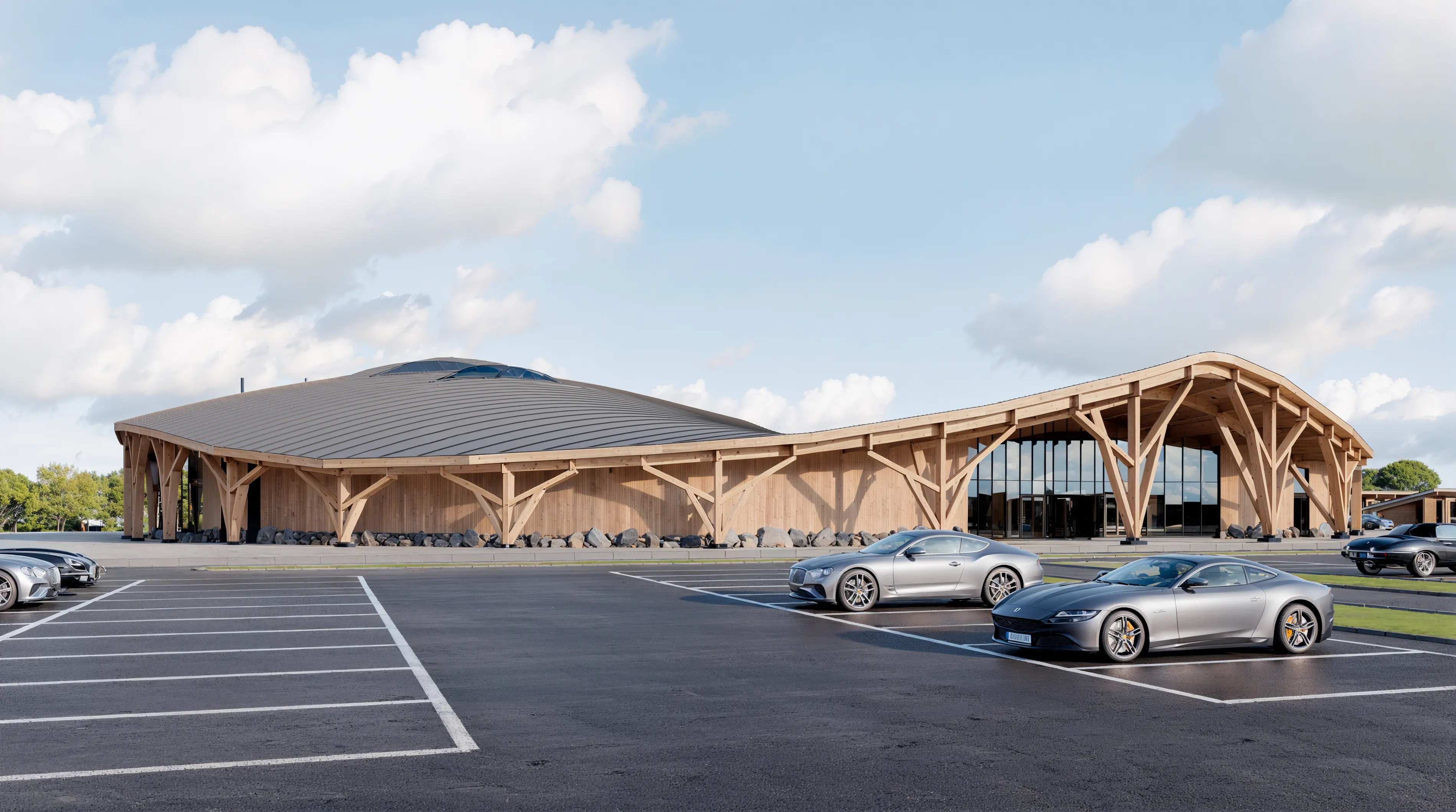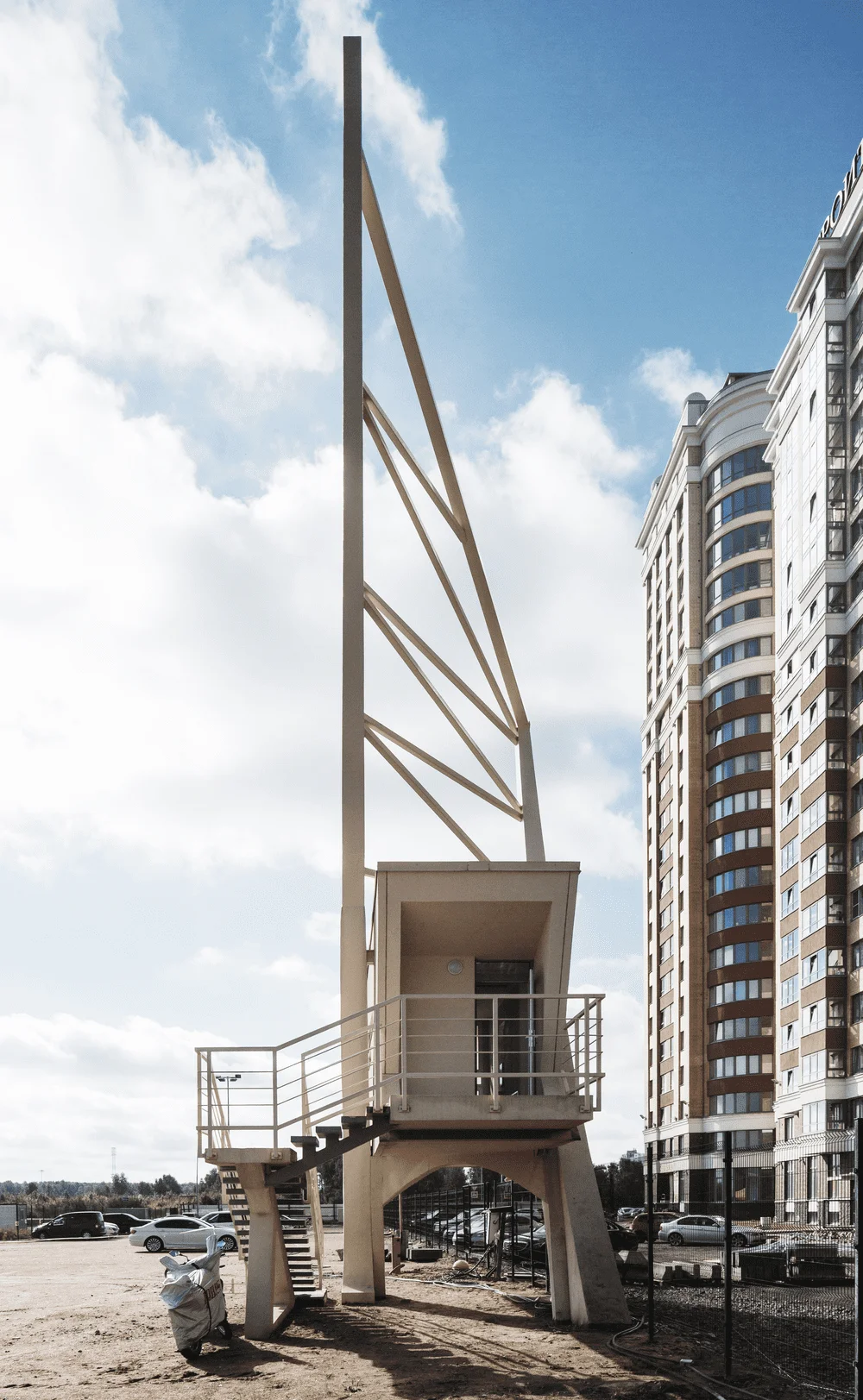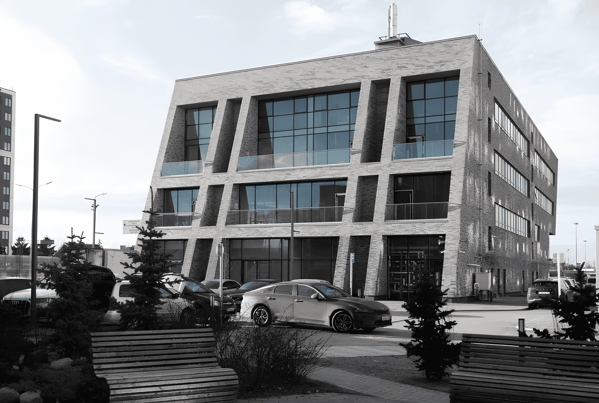 Здание расположено на выезде из Санкт-Петербурга. В его стилистике, с одной стороны, отражается любовь заказчика к финской модернистской архитектуре, а с другой – ясный и лаконичный силуэт контрастирует с внутренним динамизмом и напряжением, создаваемым множеством монолитных плоскостей, нависающих над главным входом.