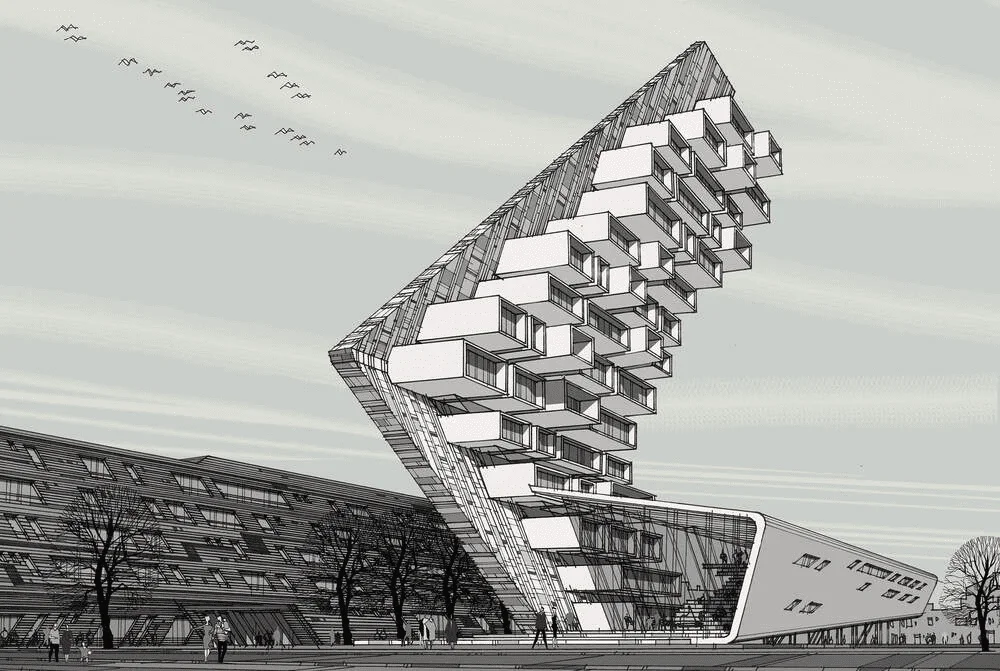 С одной стороны, этот наклон связан с природными особенностями данного места – частыми северными ветрами с Финского залива, и этот наклон монолитной формы с закругленным углом как будто противостоит силам природы. Словно под воздействием дождя и ветра угол здания был сглажен, а боковые грани отполированы. Ленточные окна на боковых фасадах подчеркивают направление воздействия сил природы.