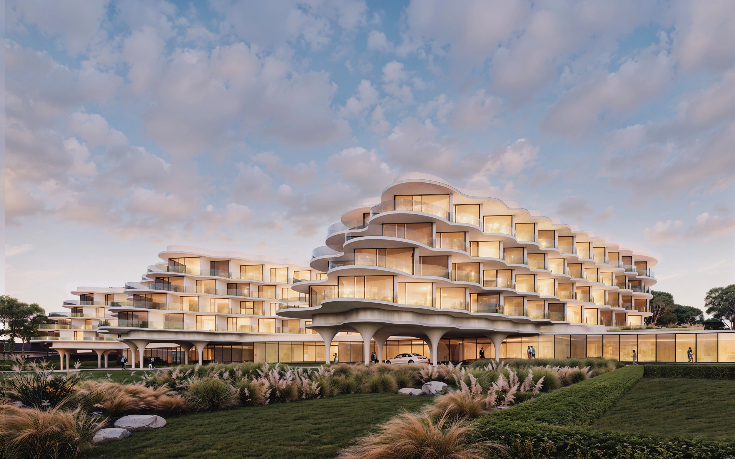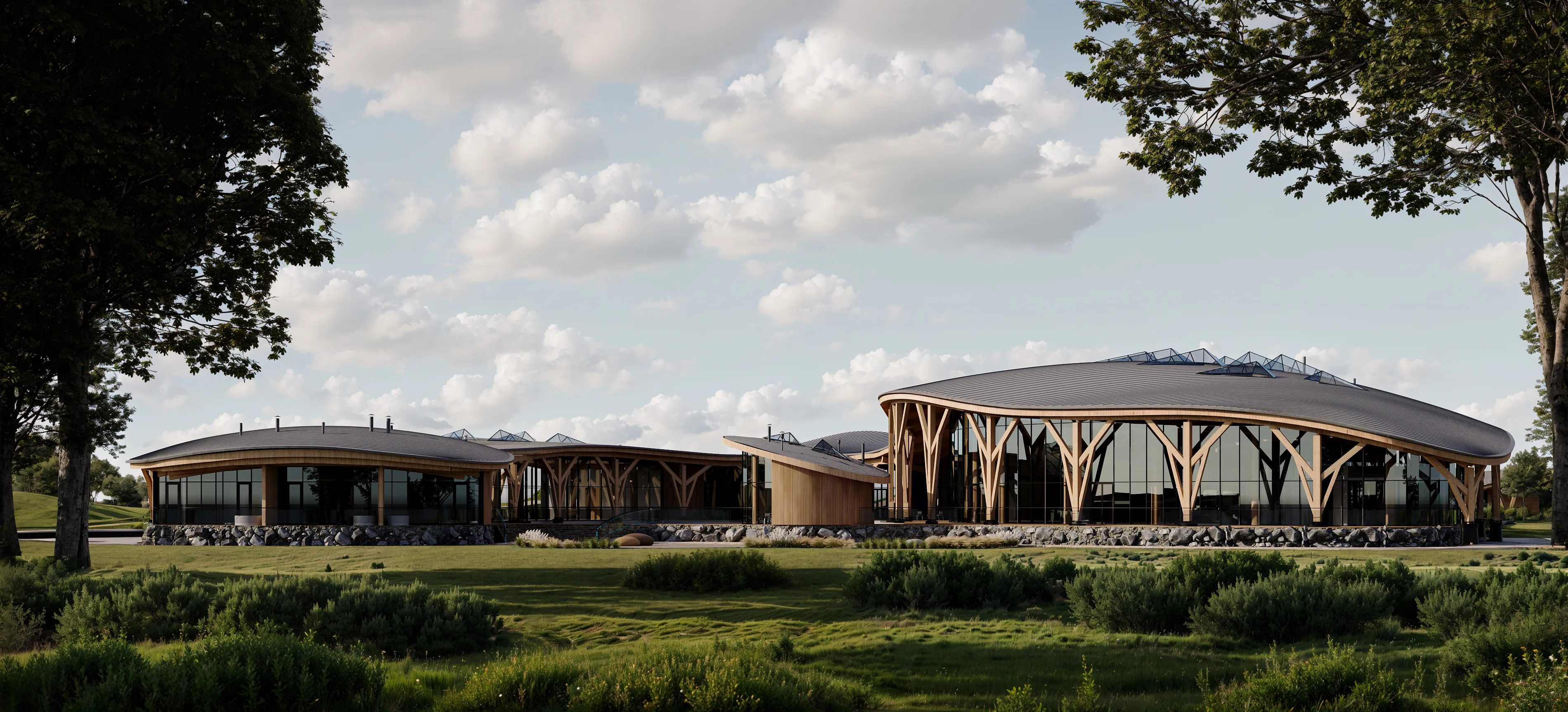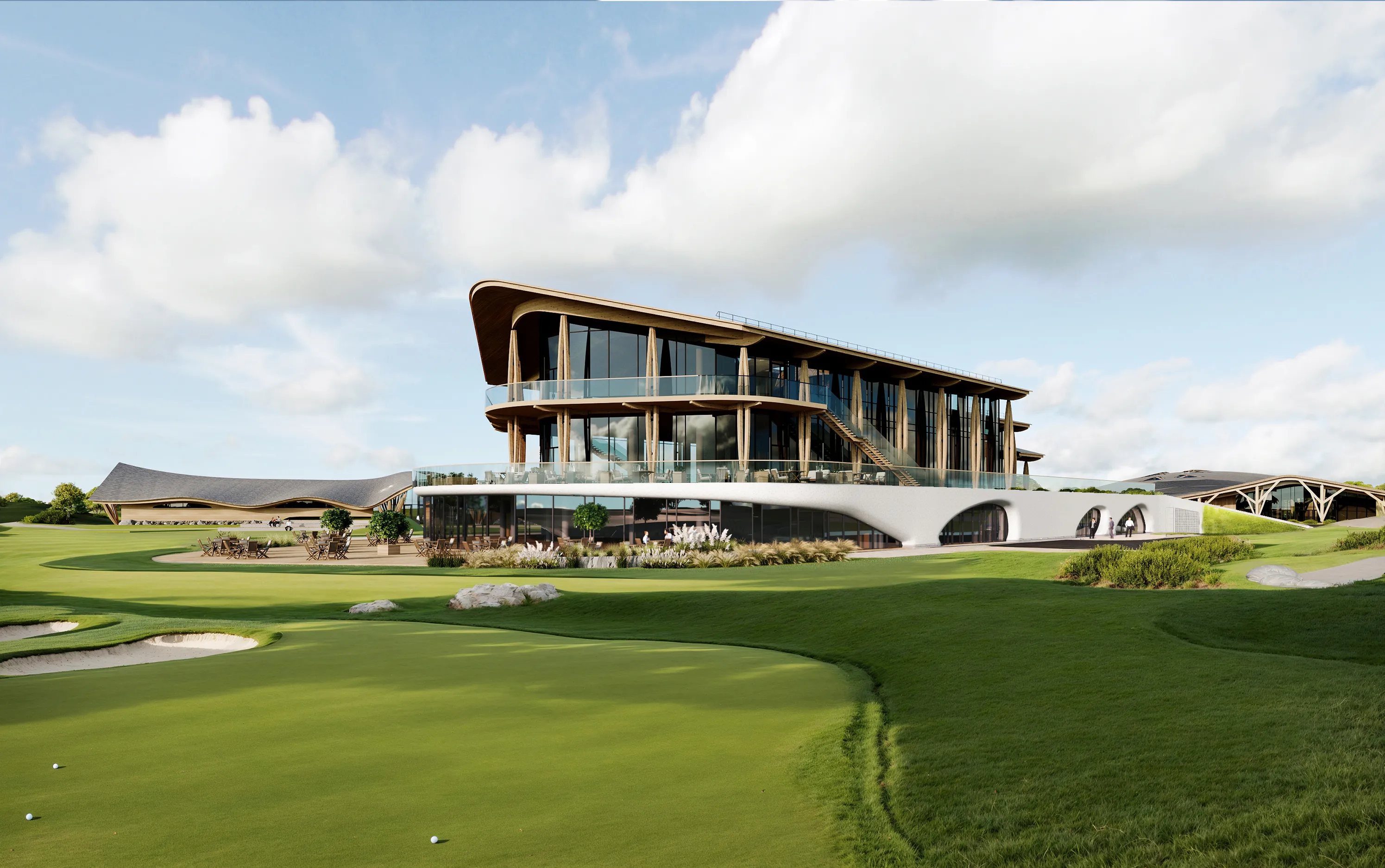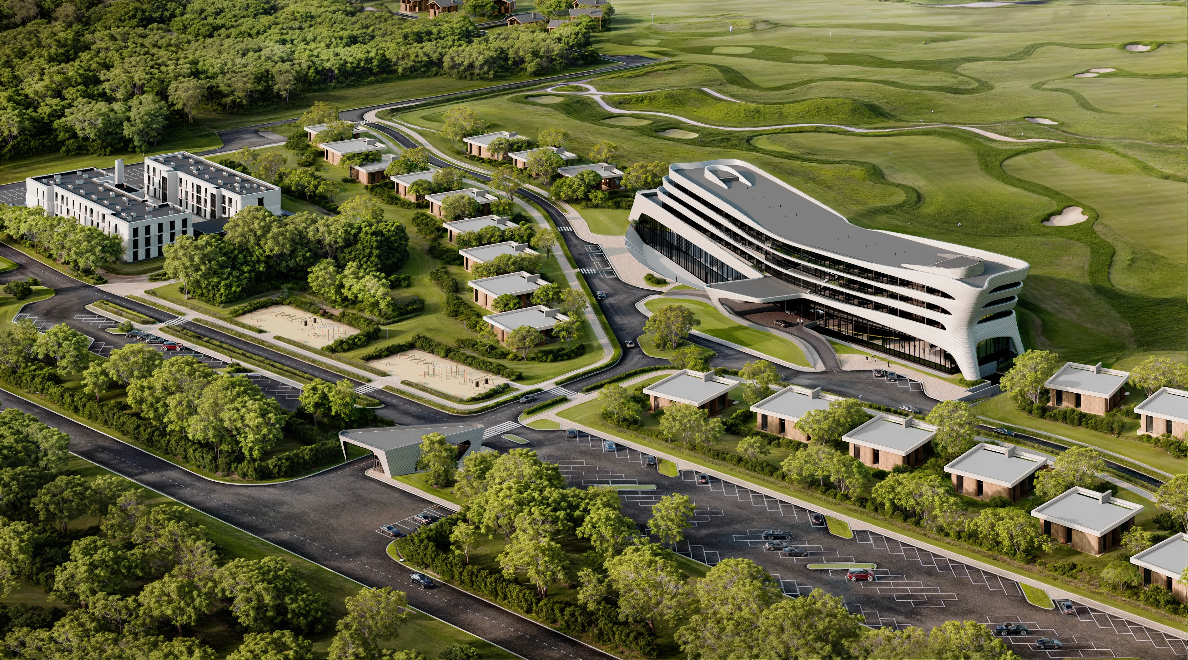 В основе архитектурной композиции комплекса лежит идея единения с природой. Одной из доминант территории гольф-курорта является протяженный белоснежный объем гостиничного-оздоровительного комплекса с выразительным силуэтом. Бионическая форма здания повторяет сложный рельеф гольф-полей. Объекты спортивной и развлекательной инфраструктуры решены в стиле современных шале, выполненных из природных материалов – дерева и натурального камня.
