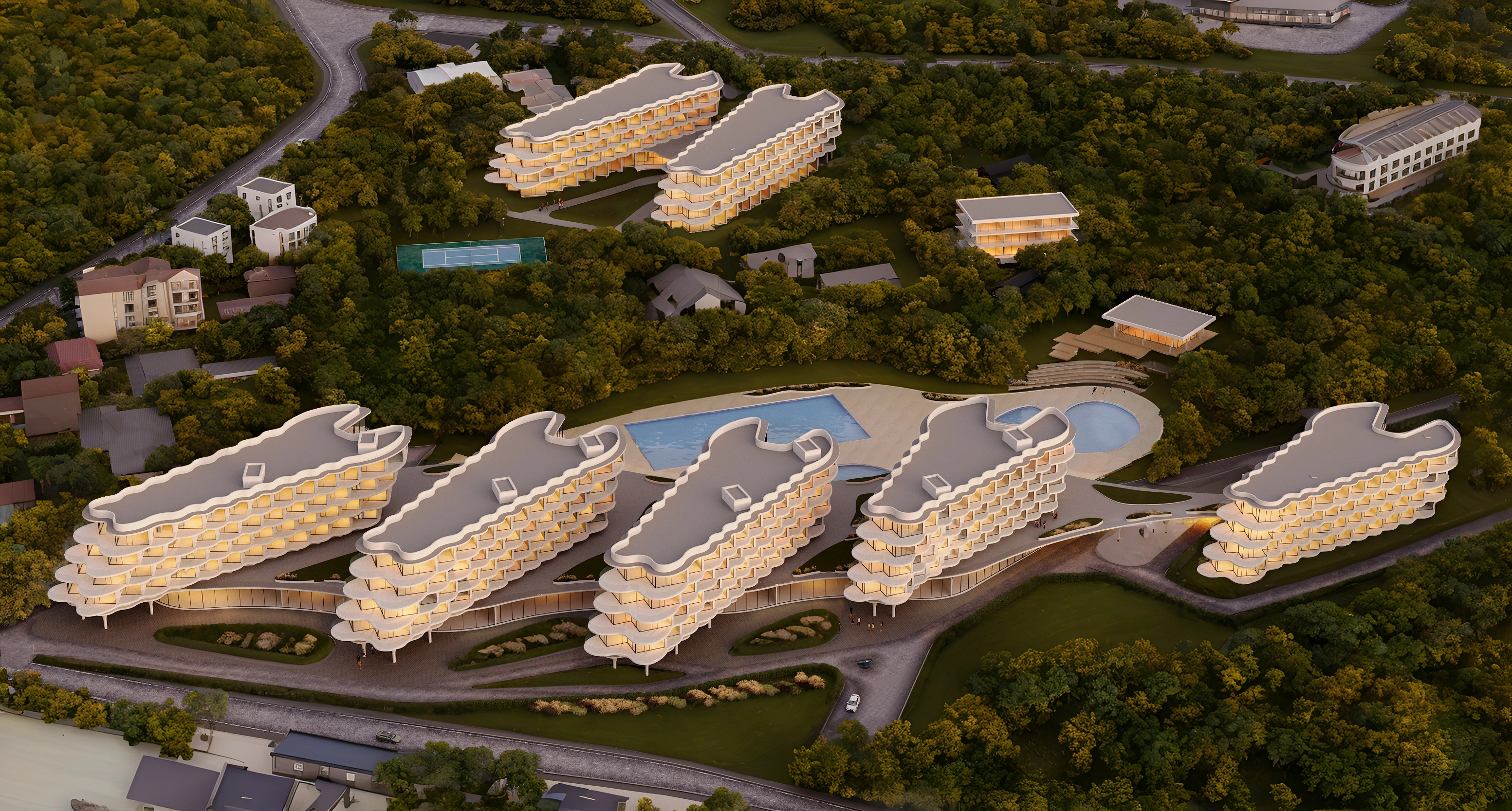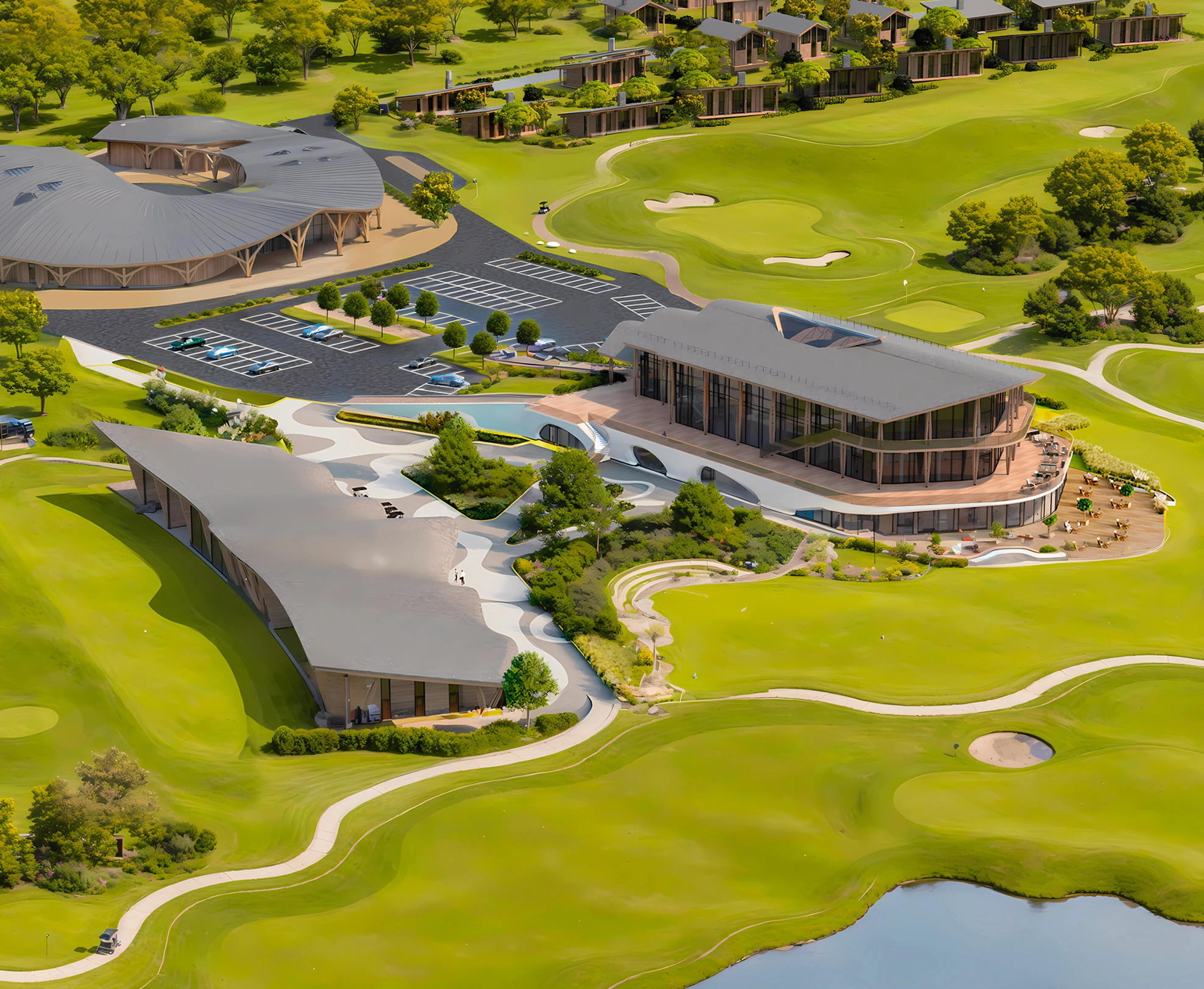 В составе гольф-курорта запроектировано 24-х луночное гольф-поле, клубный дом, Академия гольфа, акватермальный комплекс, гостиница категории 5 звезд с медицинско-оздоровительным центром, а также малоэтажные гостиничные корпуса.