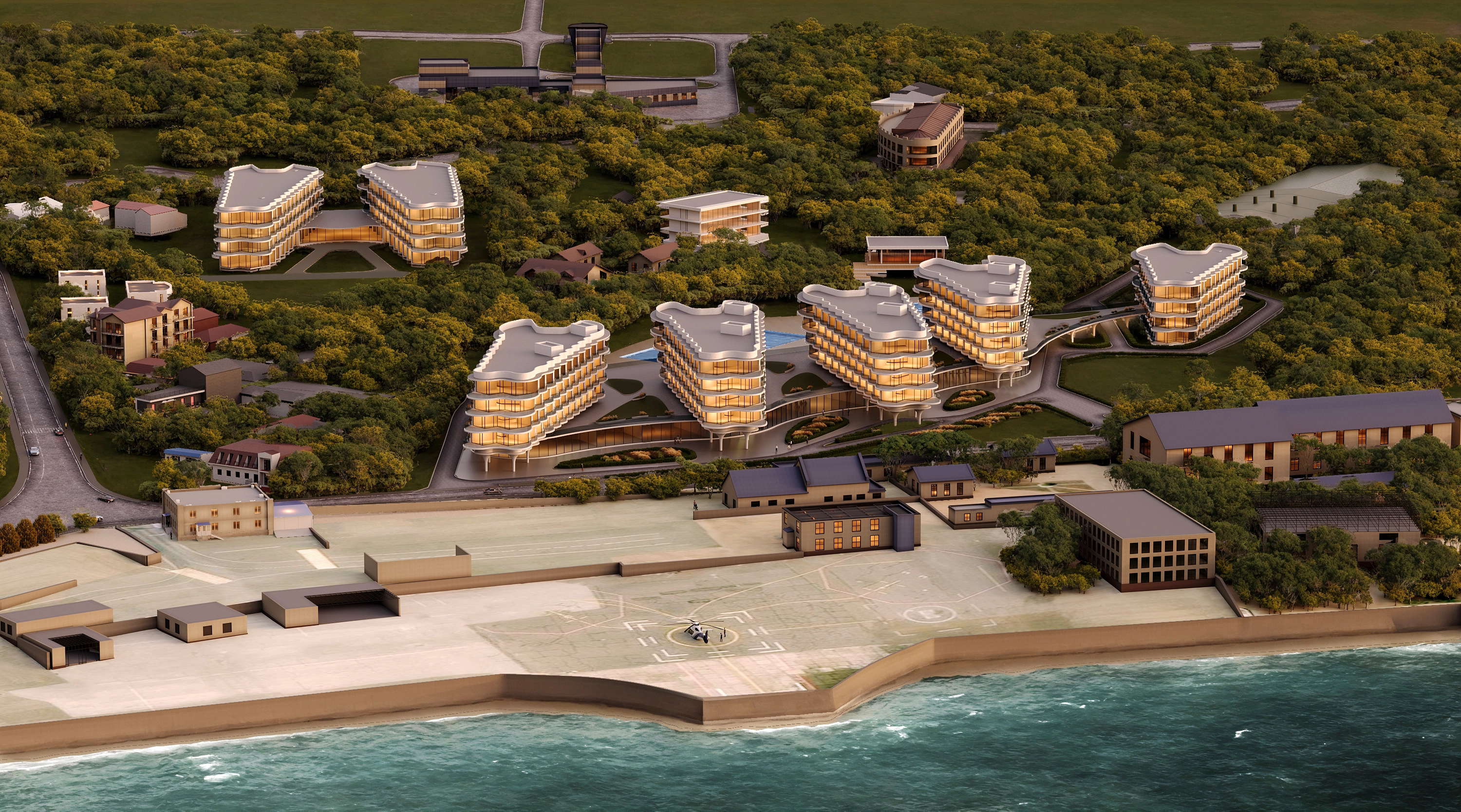 Инфраструктура курортно-гостиничного комплекса включает: гостиничные корпуса уровня 4*, СПА-центр с элементами восстановительной медицины, открытый аквацентр для взрослых и детей, точки питания, инфраструктуру для занятий спортом, места для активного и пассивного отдыха, детские зоны.