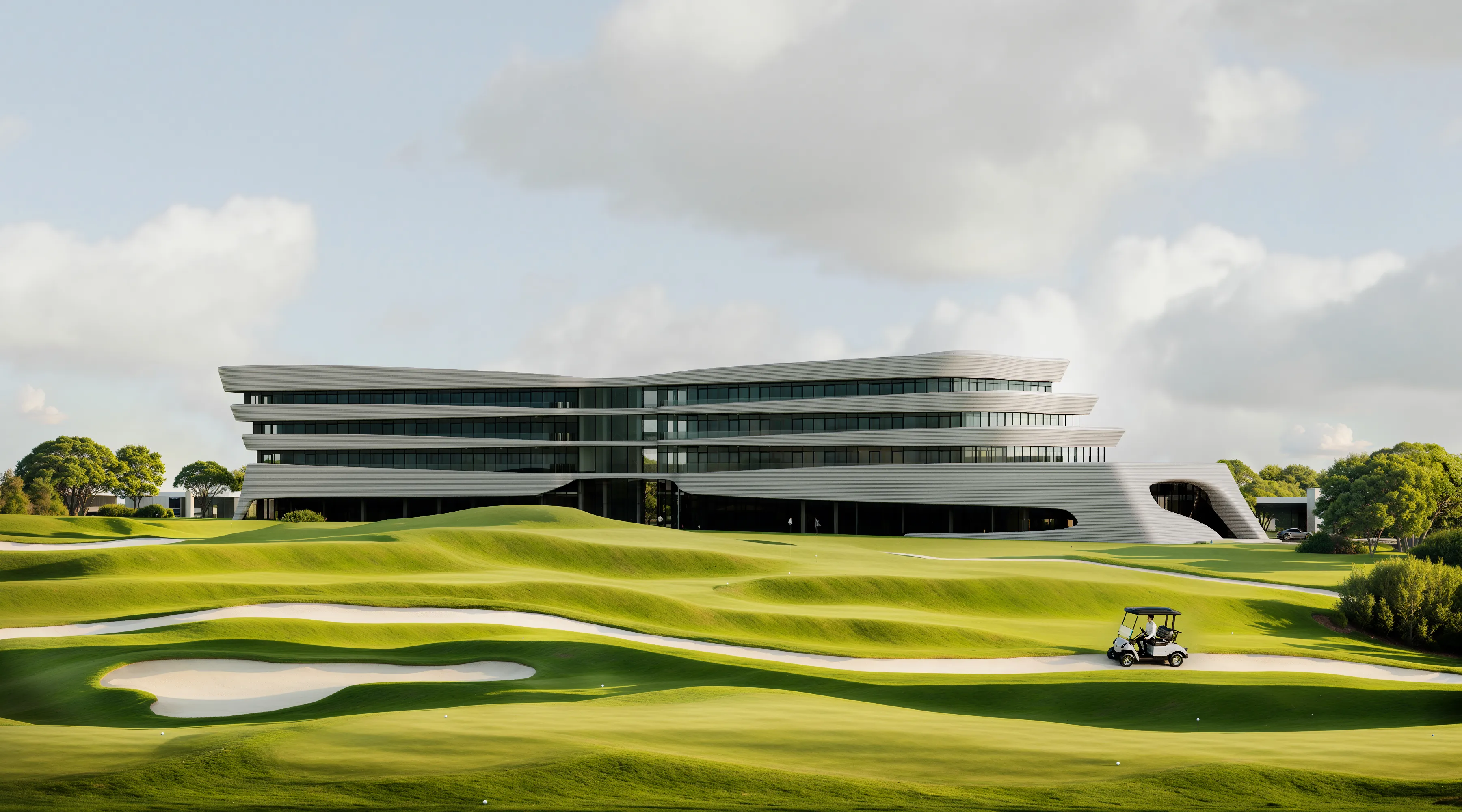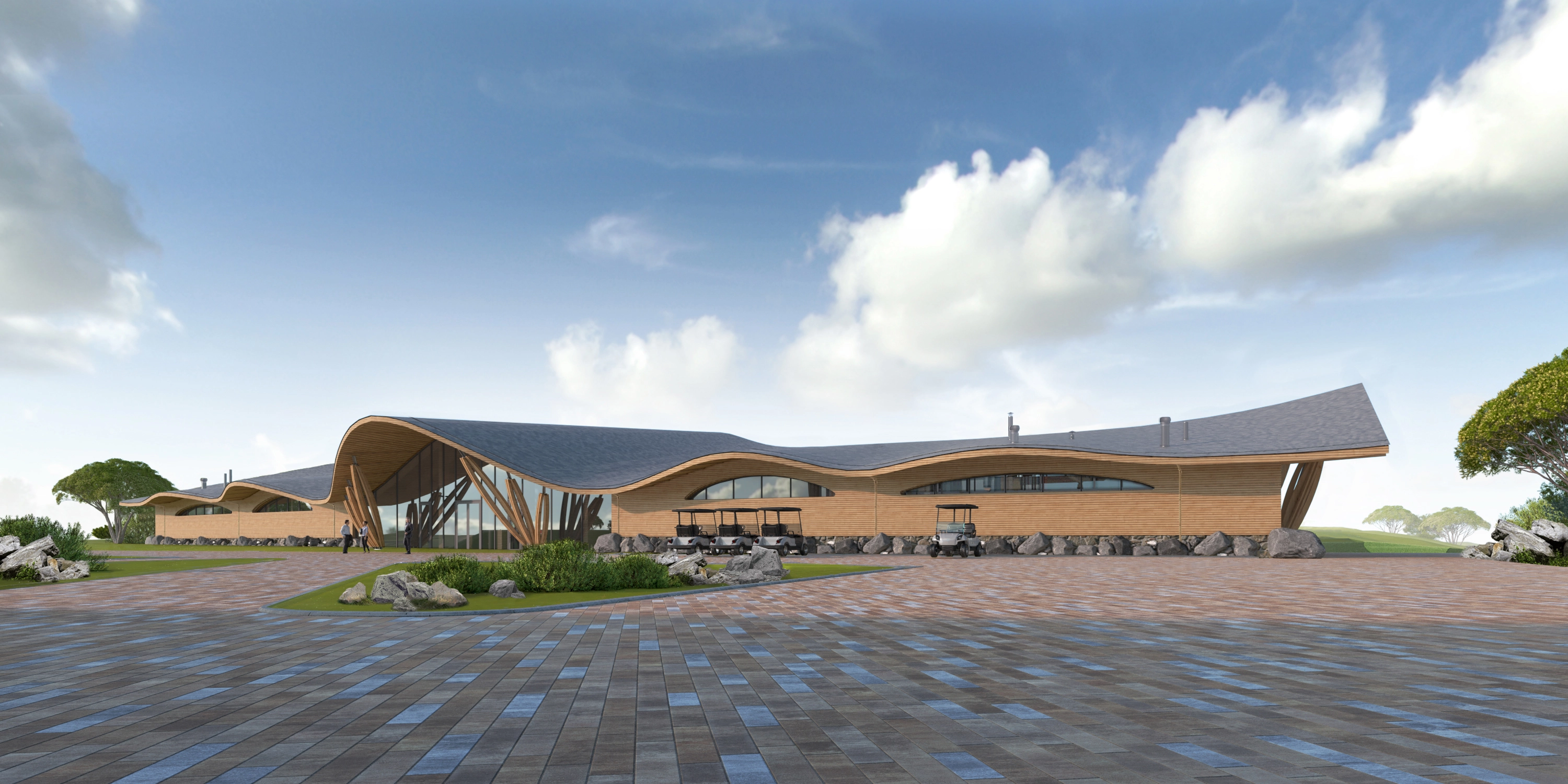 Клубный дом проекту имеет вытянутую прямоугольную форму в плане с одним скругленным фасадом. Центральный вход организован с уровня второго этажа, подъезд автомобилей осуществляется по рампе, предусмотрен отдельный пандус для гольф-каров. В трехэтажном здании разместятся просторный вестибюль с гардеробной, ресторан с обеденным залом на 150 человек, спорт-бар, зона симуляторов игры в гольф, раздевальные, гараж для гольф-каров и другое.